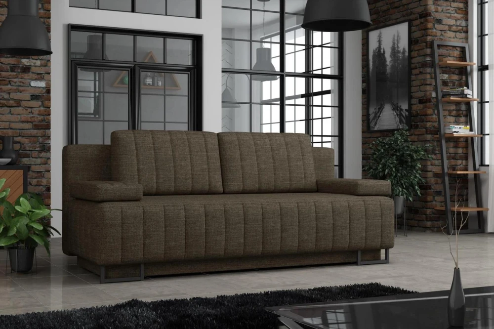 Gina je nadčasová pohovka s nádechem velmi oblíbeného retro designu. Výborně doplní jakýkoliv interiér, kde je pohodlí prioritou. Pohodlí při sezení zajišťují pružiny typu bonell v kombinaci s kvalitní PUR pěnou. Praktickou stránkou pohovky je možnost rozložení. Jednoduše, pomocí automatu, ji rozložíte na dostatčně velké lůžko k příležitostnému přespání návštěvy. Pohovka má také nezbytný úložný prostor, který využijete např.na lůžkoviny. Pohovka je potažena kvalitní látkou a nabízíme ji v několika trendy odstínech. Vyobrazené dopňky a dekorace nejsou v ceně.