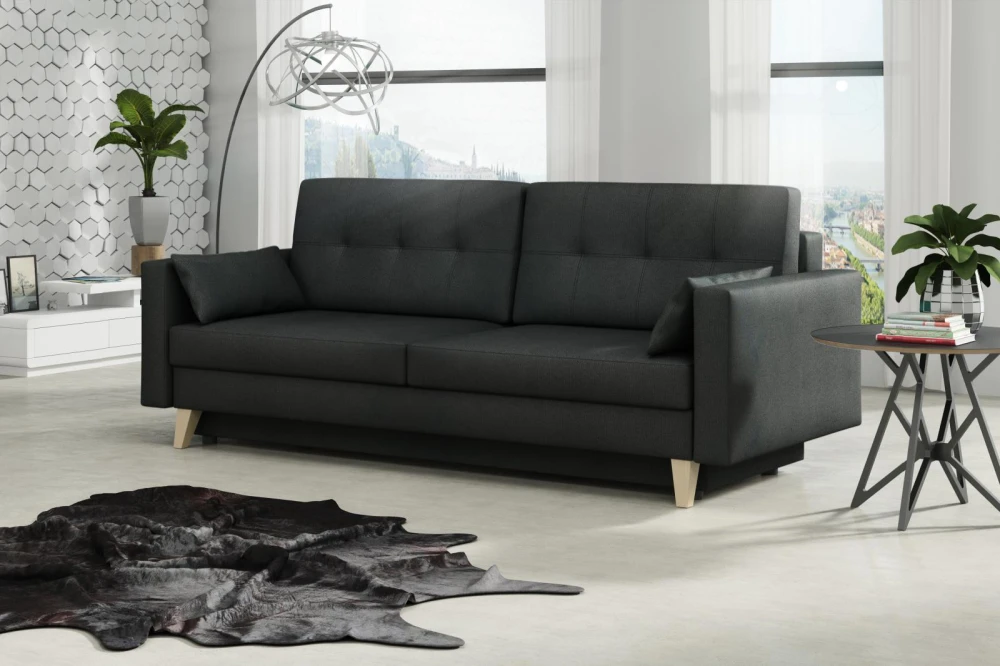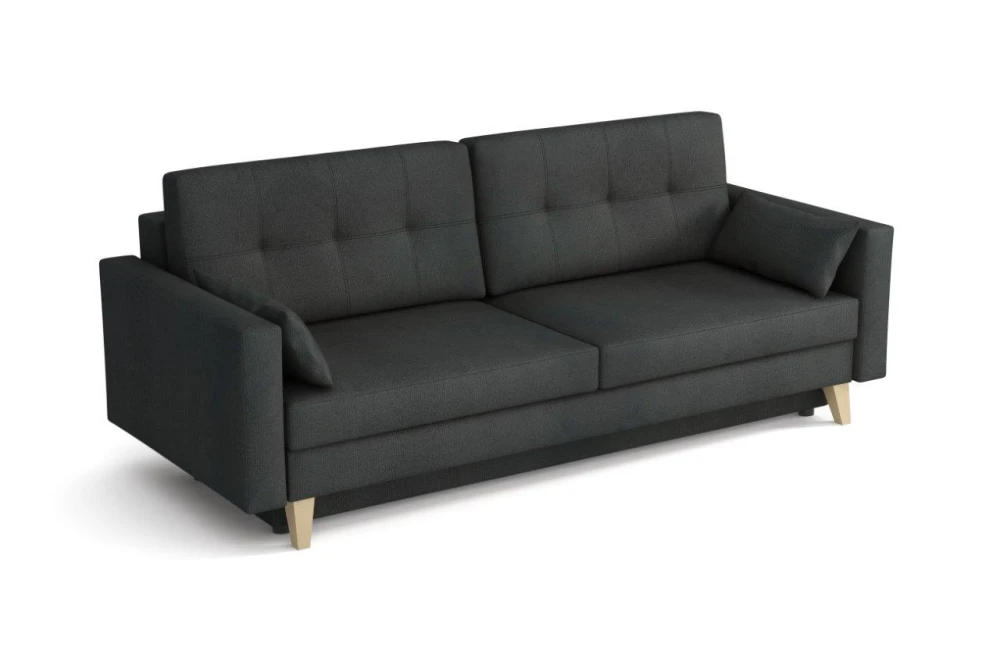 Pohovka Marina je krásným elegantním kouskem s nádechem RETRO designu a výborně zapadne do každého interiéru. Retro design podtrhují zešikmené dřevěné nohy a látkové knoflíky na opěrce. Pohovka je rozkládací a samozřejmostí je i nepostradatelný úložný prostor. Jednoduchým rozložením pomocí automatu vznikne dostatečně prostorné lůžko občasnému přespání Vaší návštěvy. Výpň sedáku tvoří vlnité pružiny v kombinaci s pružinami bonell a kvalitní PUR pěnou. Pohovka je celočalouněná, takže ji můžete umístit i do prostoru. Výborně se hodí do obývacího pokoje, do pracovny či pokoje pro hosty. Pohovku nabízíme v několika trendy barvách. Vyobrazené dopňky a dekorace nejsou v ceně.