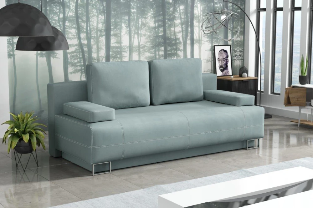 Pohovka Timmy je krásná a elegantní pohovka, která výborně zapadne do každého interiéru. Pohovka je velmi pohodlná a praktická. Praktickou stránkou pohovky je možnost rozložení - jednoduchým rozložením pomocí automatu vznikne dostatečně prostorné lůžko občasnému přespání Vaší návštěvy a samozřejmostí je také nepostradatelný úložný prostor. Pohodlí při sezení zajišťuje výpň sedáku, kterou tvoří pružiny bonell a kvalitní PUR pěna. Pohovka je potažena kvalitní voděodolnou látkou. Látka je velmi příjemná na dotek a lehce se čistí, což jistě ocení rodiny s malými dětmi nebo zvířaty. Pohovku nabízíme v několika trendy odstínech. Vyobrazené dopňky a dekorace nejsou v ceně.