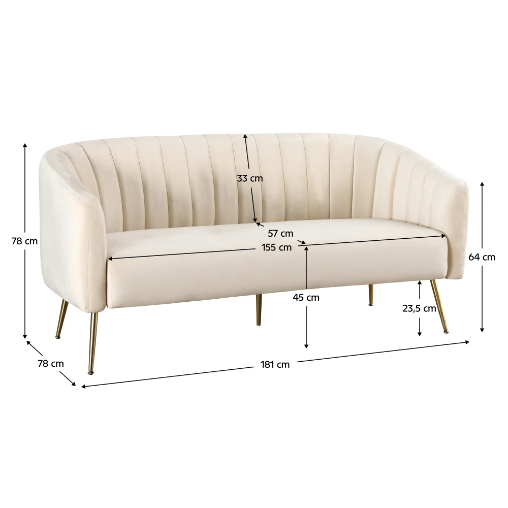 Elegantní pohovka v béžové velvet látce v kombinaci se zlatou chromovou konstrukcí přináší do interiéru jemný luxus a nadčasovou eleganci. Svým vzhledem skvěle zapadne do moderních i glamour interiérů a stane se výrazným, ale zároveň harmonickým prvkem prostoru.