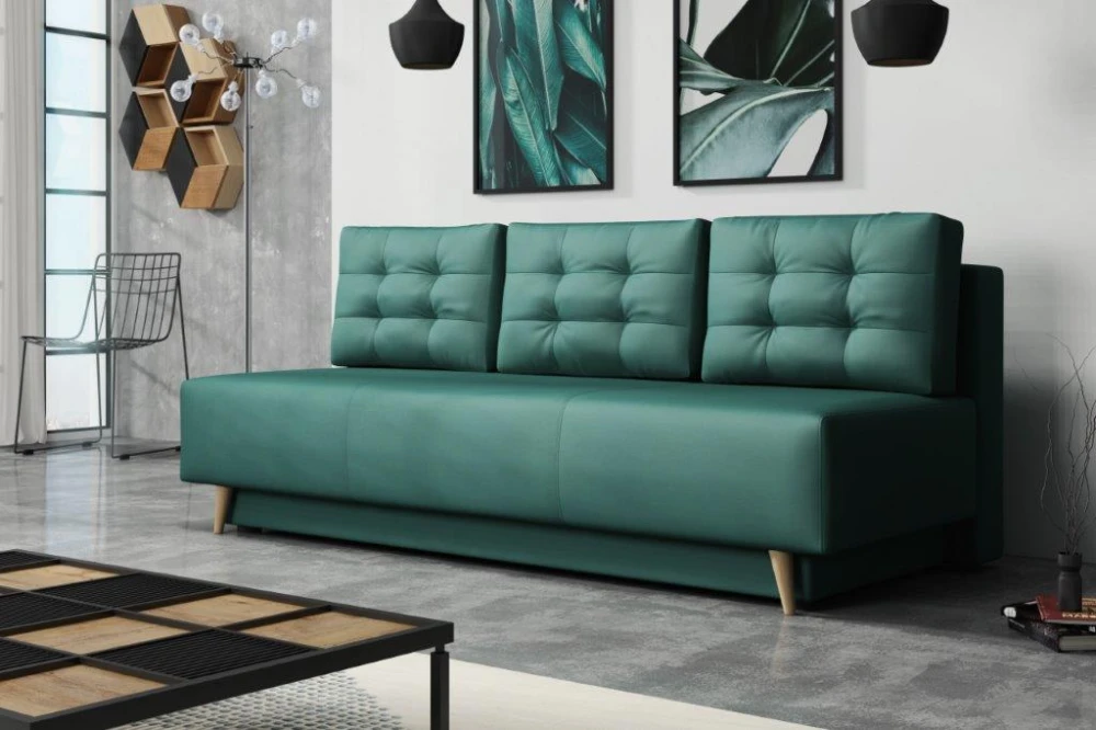 Pohovka Sebastian je elegantním kouskem sedacího nábytku s nádechem RETRO designu a výborně zapadne do každého interiéru. Retro design podtrhují zešikmené dřevěné nohy a látkové knoflíky na opěrných polštářích. Pohovka je rozkládací a samozřejmostí je i nepostradatelný úložný prostor. Jednoduchým rozložením pomocí automatu vznikne dostatečně prostorné lůžko občasnému přespání Vaší návštěvy. Výplň sedáku tvoří pružiny bonell a kvalitní PUR pěna. Pohovka je celočalouněná, takže ji můžete umístit i do prostoru. Výborně se hodí do obývacího pokoje, do pracovny či pokoje pro hosty. Pohovku nabízíme v několika trendy barvách. Vyobrazené doplňky a dekorace nejsou v ceně.