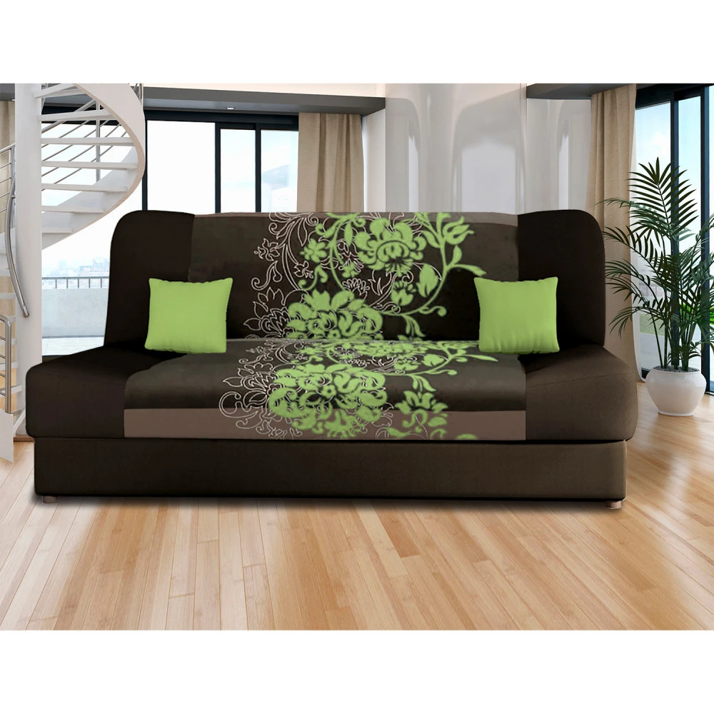 textilní potah, barevné provedení hnědá / zelená světlejší pruh a motiv květů na sedací a opěradlové části může být umístěn i v jiné poloze, než je na obrázku jádro z vlnité pružiny, výška sedu 40 cm, hloubka sedu 55 cm, rozměr rozložené 190 × 120 cm rozkládací s úložným prostorem, rozkládání KLIK-KLAK (postup uveden v návodu k montáži) po složení do polohy k sedu upravte krycí látku v zadní části tak, aby zakryla rozkládací mechanizmus