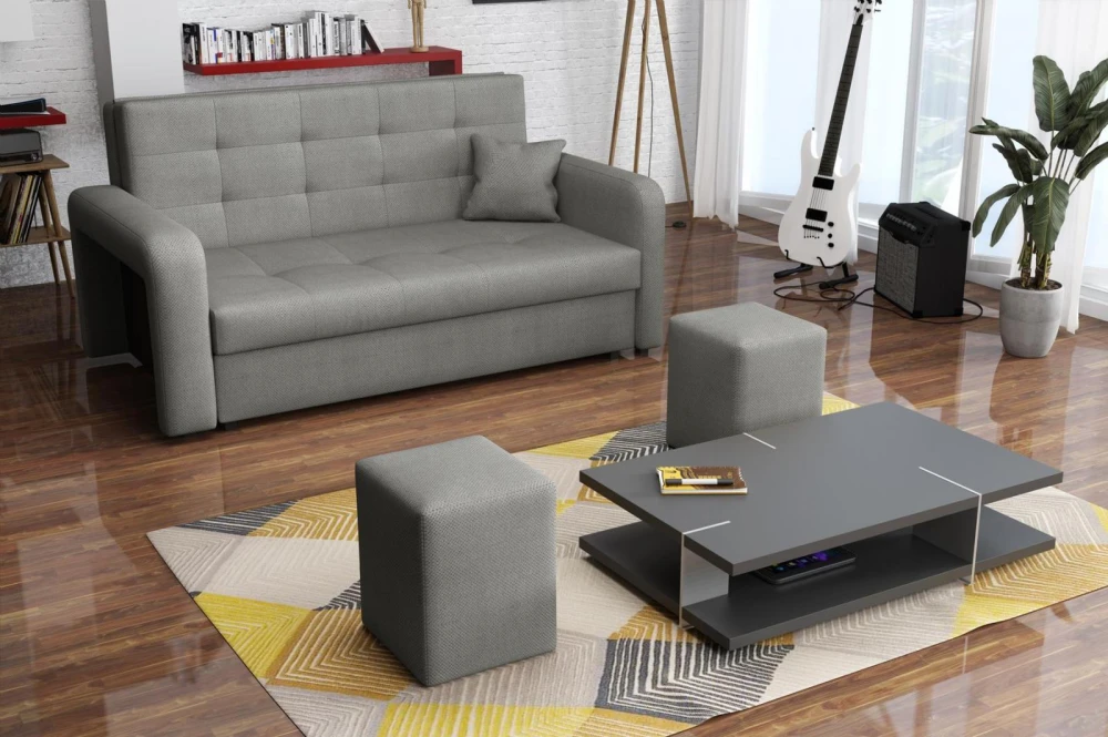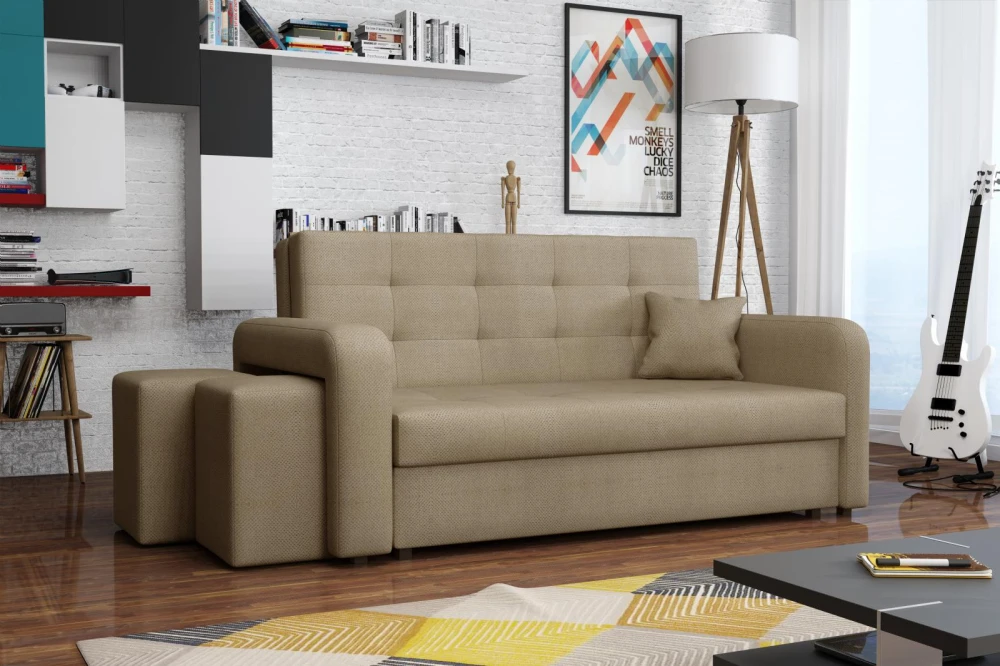 Rozkládací pohovka Vivian je díky svým rozměrům vhodná i do menších pokojů. Své uplatnění najde nejen v obývacím pokoji, ale také v dětském, studentském, nebo hostinském pokoji. Jednoduchým rozložením pomocí automatu, získáte lůžko k příležitostnému přespání Vaší návštěvy. Výplň sedáku tvoří vlnité pružiny v kombinaci s PUR pěnou. Pohovka je potažena kvalitní látkou a nabízíme ji v několika trendy odstínech. Pohovka disponuje i nepostradatelným úložným prostorem, který využijete např. na deku a polštář. V ceně pohovky je 1 dekorační polštář a 2 taburety, které jsou důmyslně uložené v područi pohovky. Taburety můžety využít k sezení, nebo k podepření nohou při odpočinku. Ostatní vyobrazené dekorace nejsou v ceně. Vyobrazené dopňky a dekorace nejsou v ceně.