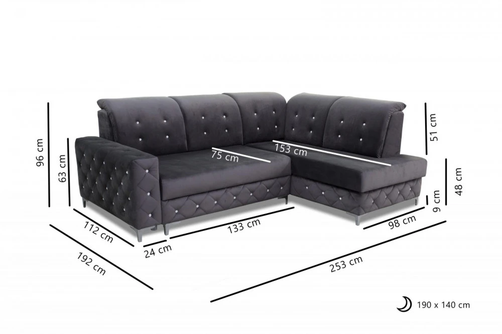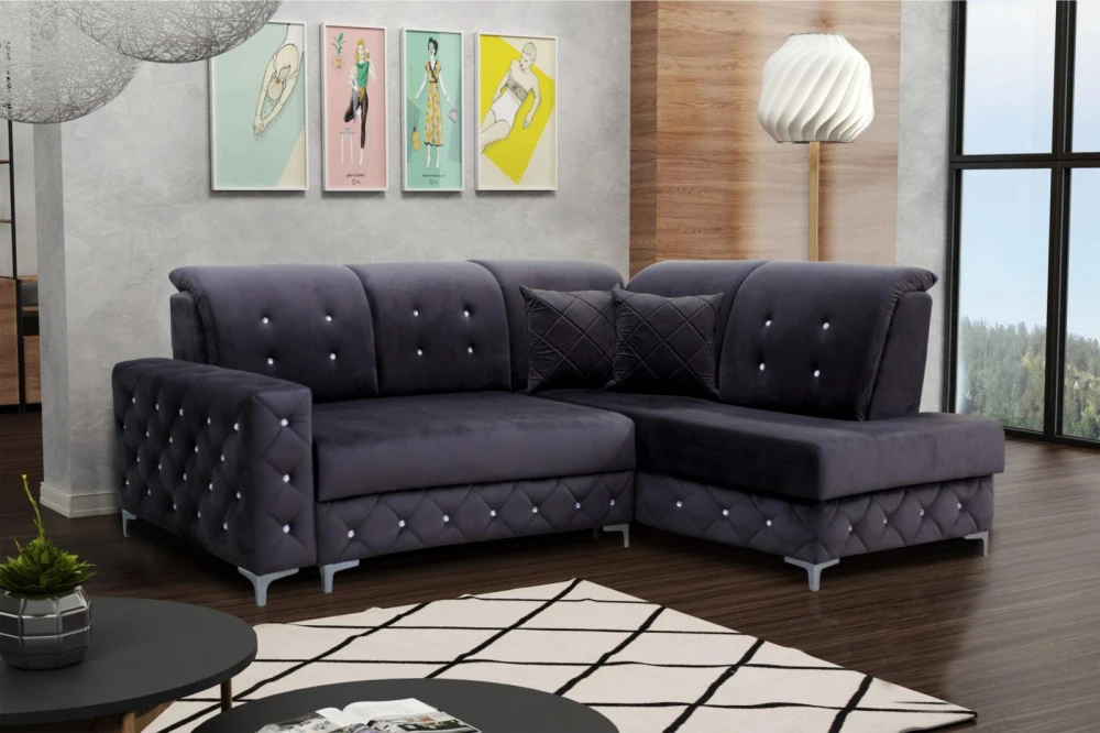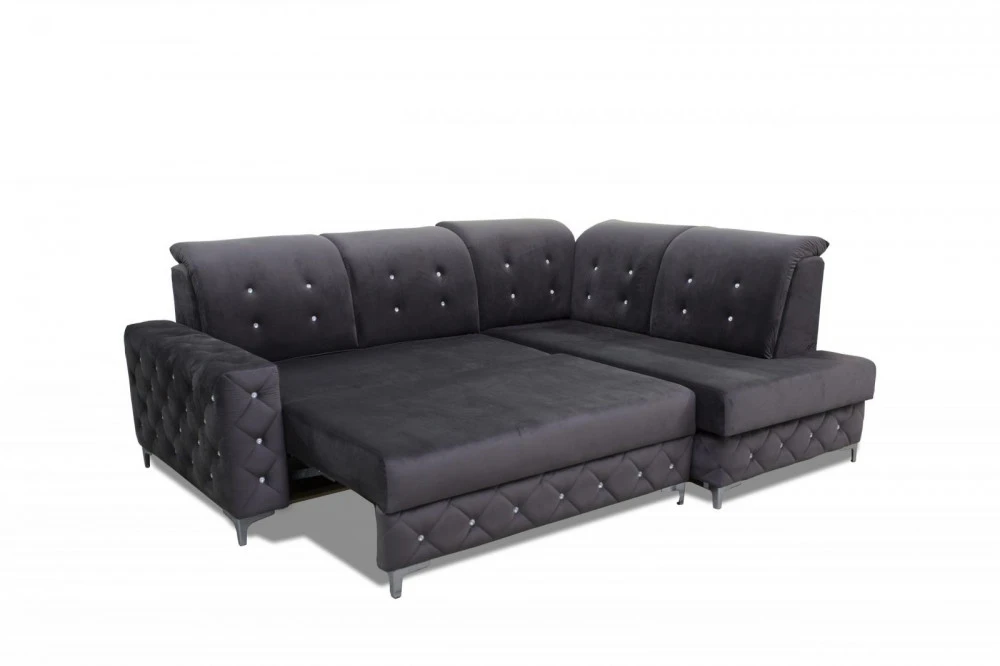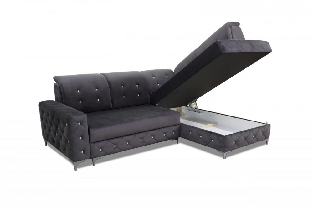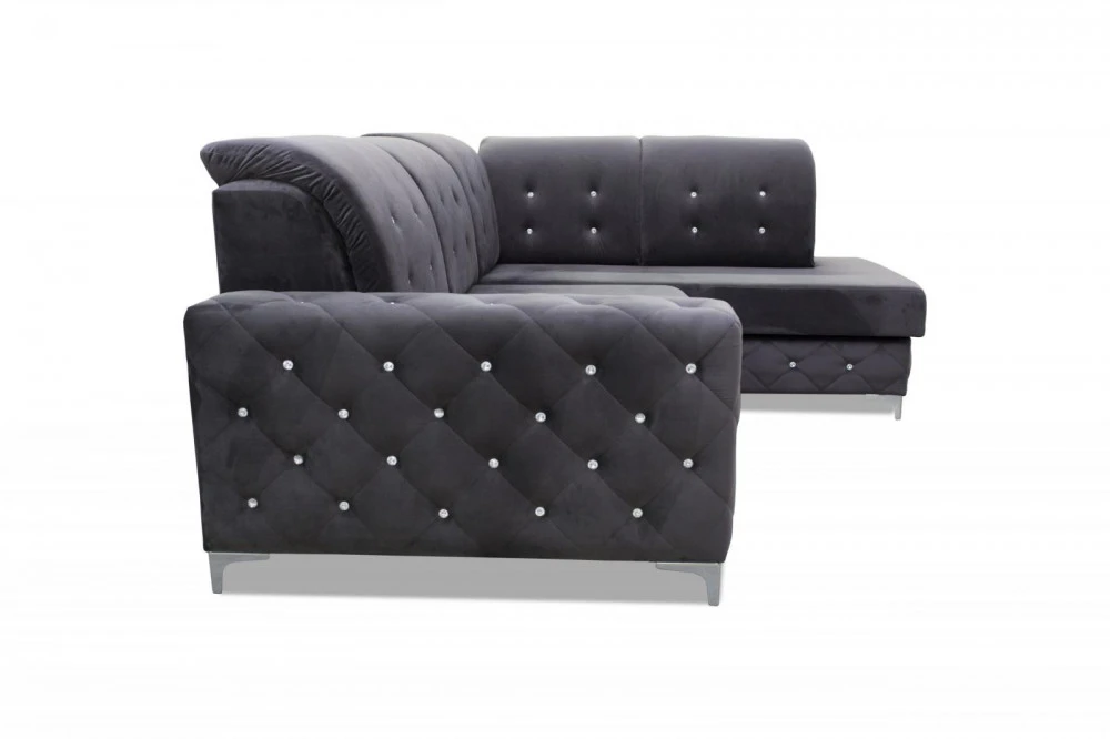Designová sedací souprava v krásné kombinaci tmavě šedé látky a ozdobného prošití s krystalky.. Sedačka je vyrobena z pružin v kombinaci s kvalitní PUR pěnou. Sedačka je rozkládací s praktickým úložným prostorem. Třpytivé krystalky jí dodávají na jedinečnosti a bude se vyjímat v každém interiéru. Sedací souprava je požena kvalitní potahovou látkou Monolith, která vyniká speciální povrchovou úpravou "Water repellent". Ta chrání povrch textilie před rychlým prosakováním tekutin. Sedací soupravu nabízíme v levém i pravém provedení.
