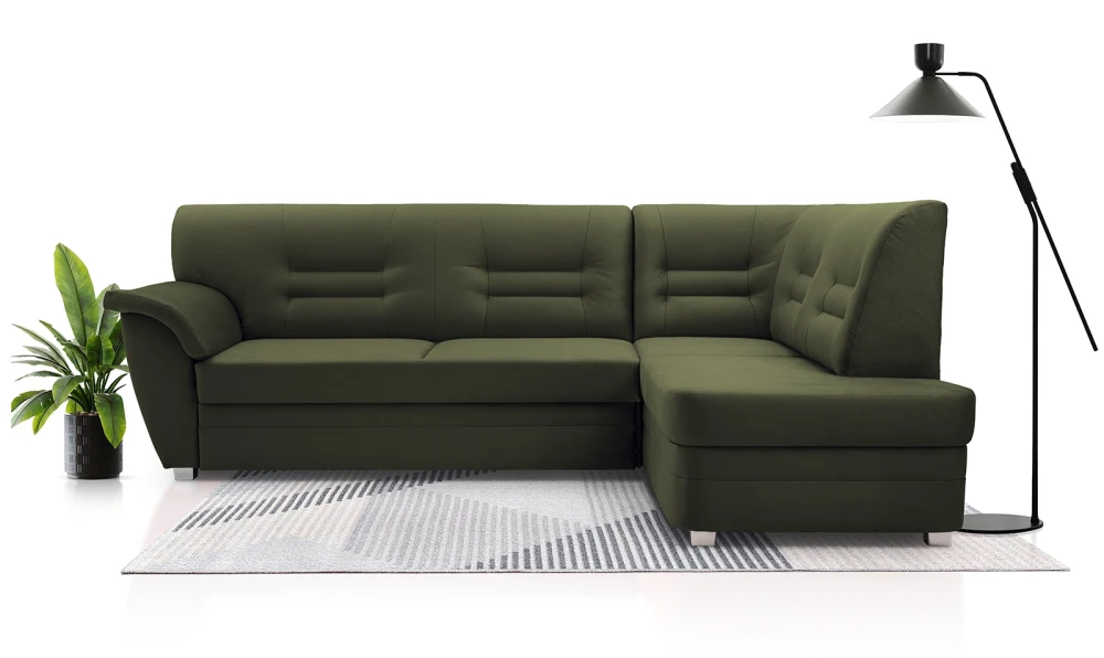 Moderní, rohová sedací souprava Dornia je rozkládací. Jednoduchým rozkladem vzniká lůžko vhodné k příležitostnému spaní. Má uložný prostor, který lze využít například na lůžkoviny. Sedací souprava je pružinová v kombinaci s kvalitní PUR pěnou. Je celočalouněná a je možno ji umístit také do prostoru. Na úvodním obrázku je sedací souprava vyobrazena v pravém provedení. Správná barva je zobrazena na první fotografii. Ostaní fotografie jsou pouze ilustrační. Vyobrazené doplňky a dekorace nejsou v ceně.