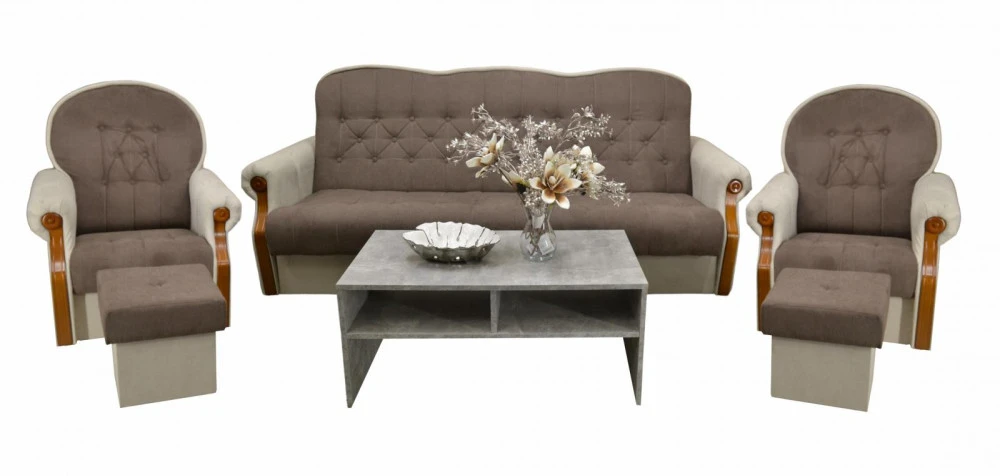 Sedací souprava Petra je stále velmi oblíbeným klasickým modelem sedací soupravy v provedení 3F+1+1. Je velmi pohodlná a zároveň praktická. Sedací souprava je rozkládací a samozřejmostí je i úložný prostor. Jednoduchým rozkladem pomocí systému "klik klak" vznikne lůžko k příležitostnému přespání Vaší návštěvy. Pohodlí při sezení poskytuje kvalitní výplň sedáků a vysoká opěrka zad. Sedací souprava je potažena kvalitní látkou, v kombinaci barev " tón v tónu ". Cena sedací soupravy je uvedena za rozkládací trojsed a dvě křesla a 2 taburety.