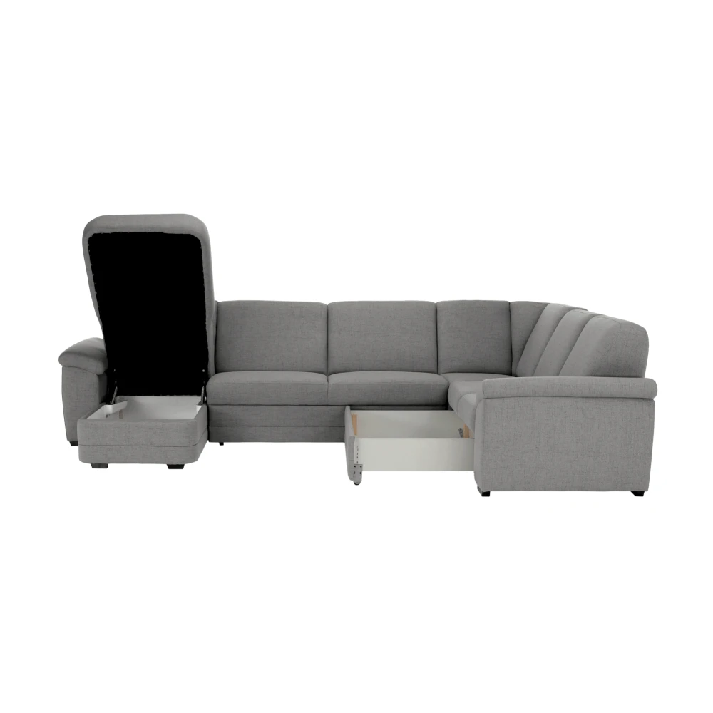 Tato sedací souprava do tvaru U je ideální volbou pro zákazníky, kteří hledají prostorné sezení, vysoký komfort a praktické funkce v moderním provedení. Díky velkorysým rozměrům se perfektně hodí do větších obývacích pokojů a poskytne dostatek místa pro rodinu i návštěvy.