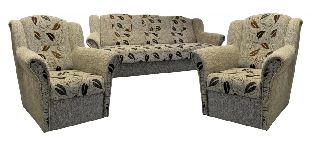 Klasická rozkládací sedací souprava vhodná také do menších bytů. Sedací souprava má praktický úložný prostor a jednoduchým rozkladem vznikne lůžko vhodné k příležitostnému spaní. Sedací souprava je pružinová v kombinaci s kvalitní PUR pěnou. Sedací souprava se skládá z rozkládacího trojsedu a dvou křesel. Tato sedačka je očalouněná kvalitní potahovou látkou, snadno čistitelnou suchou pěnou.