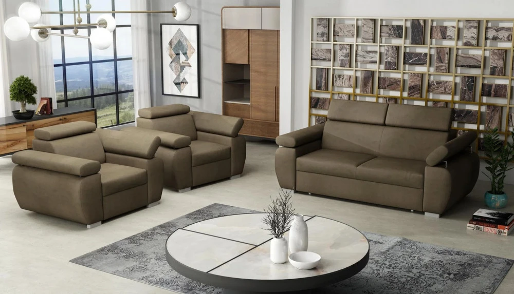 Sedací souprava Bodie je vyrobena v jednoduchém elegantním designu, který se hodí do všech interiérů. Sedací souprava je potažena kvalitní látkou Paros, která je sametově hebká a nežmolkovatí. Je odolná proti UV záření, takže udržuje stálost barev i při denním světle. Sedací soupravu nabízíme v několika odstínech této látky. Výplň sedáků tvoří kombinace vlnitých pružin s kvalitní HR pěnou. Pro pohodlí při sezení a odpočinku, je sedací souprava vybavena polohovacími opěrkami hlavy. Cena je uvedena za sestavu 3+1+1. Vyobrazené doplňky a dekorace nejsou v ceně.