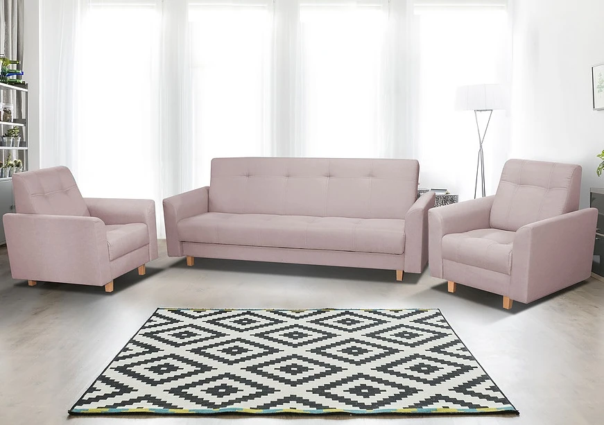 Sedací souprava Gala potěší milovníky Retro designu. Pohovka je rozkládací a samozřejmostí je i praktický úložný prostor. Retro styl podtrhují dřevěné nožky a prošití s vtahy. Je potažena látkou v pastelových barvách a můžete si vybrat ze 4 atraktivních odstínů. Výplň sedáku tvoří kombinace pružin bonell s kvalitní PUR pěnou. Jednoduchým rozložením pomocí systému klik-klak vznikne lůžko k občasnému přespání. Vyobrazené dekorace nejsou v ceně.