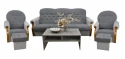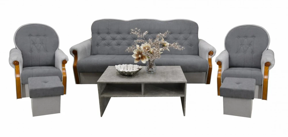 Sedací souprava Petra je stále velmi oblíbeným klasickým modelem sedací soupravy v provedení 3F+1+1. Je velmi pohodlná a zároveň praktická. Sedací souprava je rozkládací a samozřejmostí je i úložný prostor. Jednoduchým rozkladem pomocí systému "klik klak" vznikne lůžko k příležitostnému přespání Vaší návštěvy. Pohodlí při sezení poskytuje kvalitní výplň sedáků a vysoká opěrka zad. Sedací souprava je potažena kvalitní látkou, v kombinaci barev " tón v tónu ". Cena sedací soupravy je uvedena za rozkládací trojsed a dvě křesla a 2 taburety.