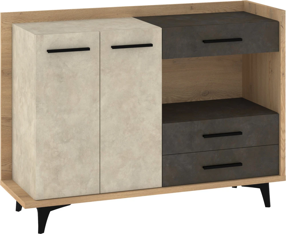 Komoda Box 02 je vybavená 3 zásuvkami, policovým prostorem, který můžete využít na uložení knížek či fotografií a dvoudveřovou skříňkou, ve které najdete 2 poličky.