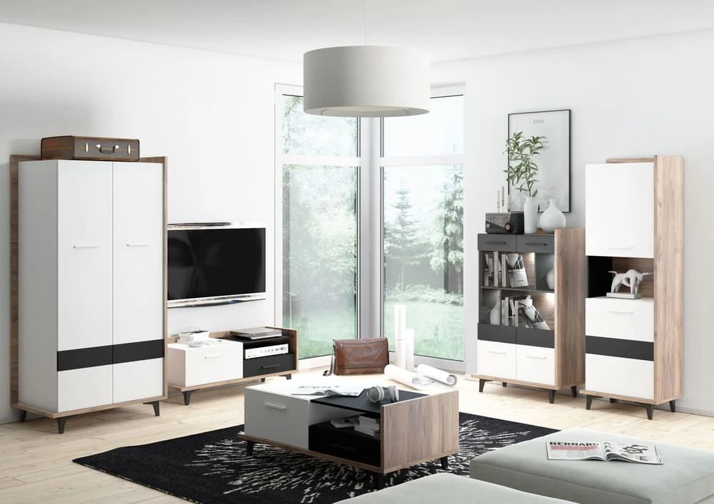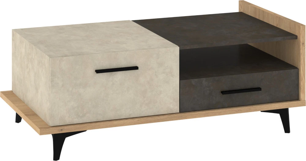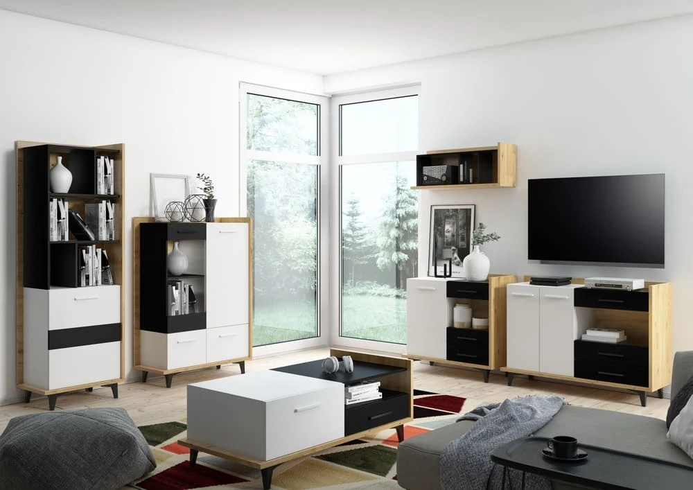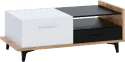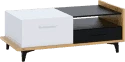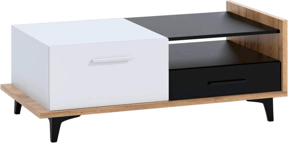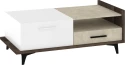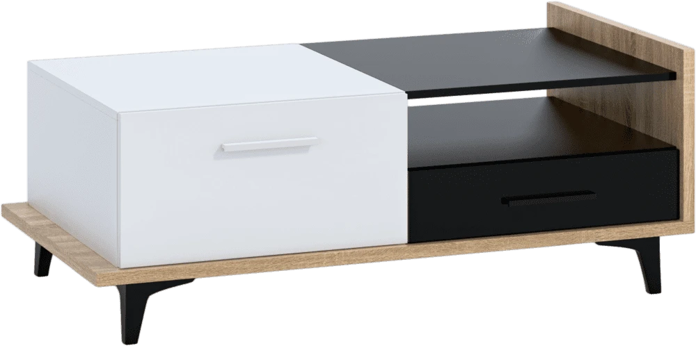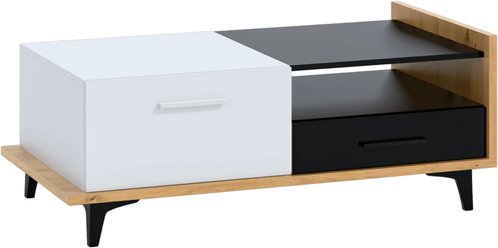 Konferenční stolek Box 03 dodá styl vašemu obýváku. Design je kombinací moderních prvků s retrem, které slaví návrat. Kombinace dřevodekorů s nestárnoucí bílo-černou kombinací je sázkou na jistotu. Konferenční stolek je součástí kolekce nábytku Box, kterou si můžete vybavit obývák nebo předsíň. Nábytek vyrobený z kvalitních lamino materiálů má hrany chráněné ABS. Kombinace 16 mm a 25 mm silných desek zajistí stabilitu a odolnost nábytku Box. Zásuvky mají kovové pojezdy opatřené tichými dojezdy. Retro nádech kolekci Box dodávají 12 cm vysoké nožky, které nejen dobře vypadají, ale také vám umožní jednoduchý úklid i pod skříňkami. Údržba nábytku je snadná, stačí vám vlhký hadřík či prachovka. Konferenční stolek Box je skvělým a zároveň praktickým doplňkem domácnosti. Je vybavený 2 výklopnými dvířky a 2 zásuvkami, to znamená, že do úložného prostoru se dostanete z obou stran stolku. Proto doporučujeme umístění stolku do prostoru nikoli ke stěně.Nabízíme vám výběr z několika moderních dekorů. Stolek dodáváme v demontu.