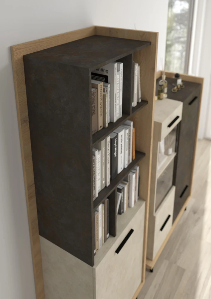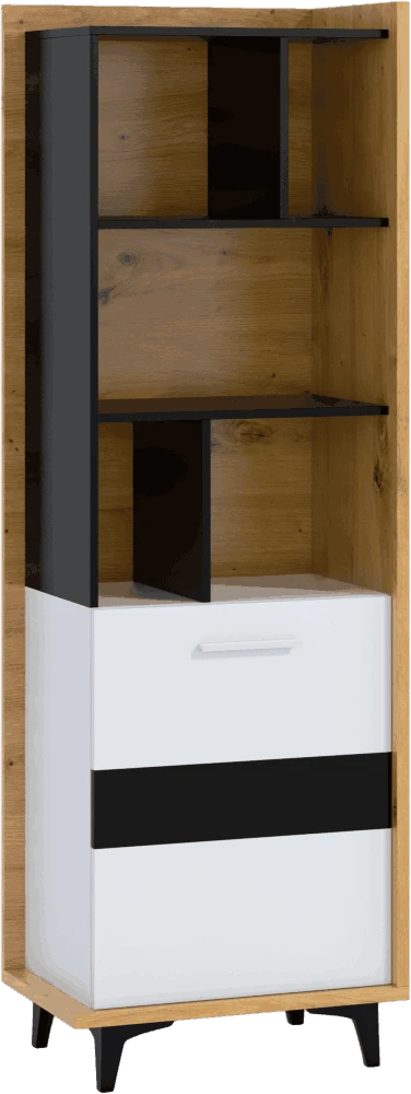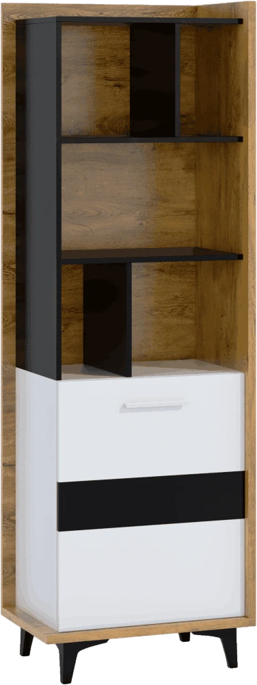Regál Box 06 dodá styl vašemu interiéru. Design je kombinací moderních prvků s retrem, které slaví návrat. Kombinace dřevodekorů s nestárnoucí bílo-černou kombinací je sázkou na jistotu.