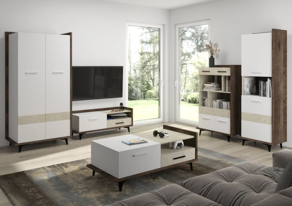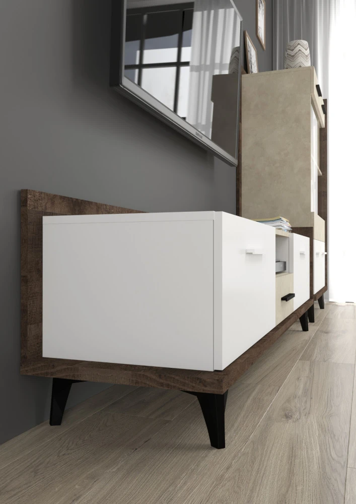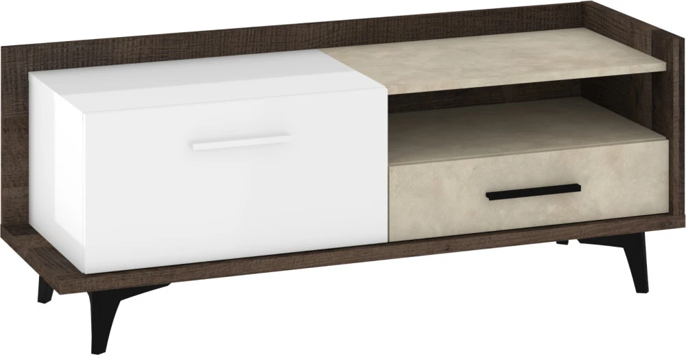 TV stolek Box 08 dodá styl vašemu interiéru. Design je kombinací moderních prvků s retrem, které slaví návrat. Kombinace dřevodekorů s nestárnoucí bílo-černou kombinací je sázkou na jistotu.