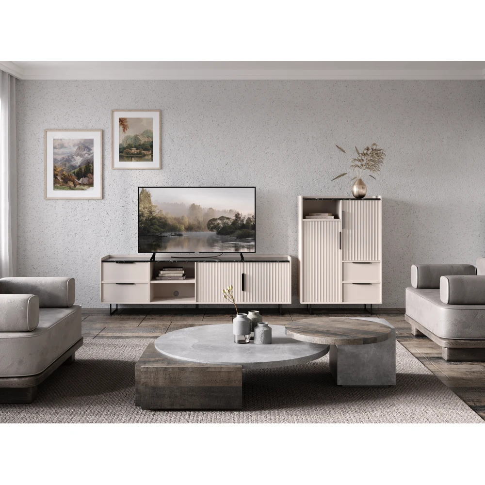 Stylový TV stolek v kombinaci kašmír a černý mramor přináší do obývacího pokoje moderní design, eleganci a funkčnost. Kontrast světlého odstínu s tmavým mramorovým dekorem vytváří výrazný a nadčasový vzhled, který se stane dominantou interiéru.