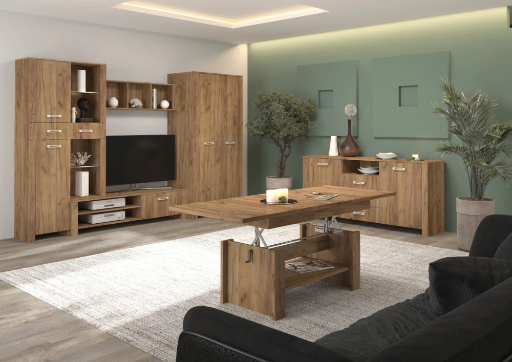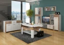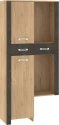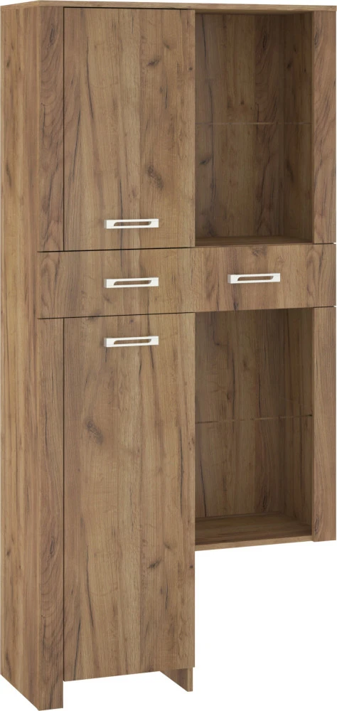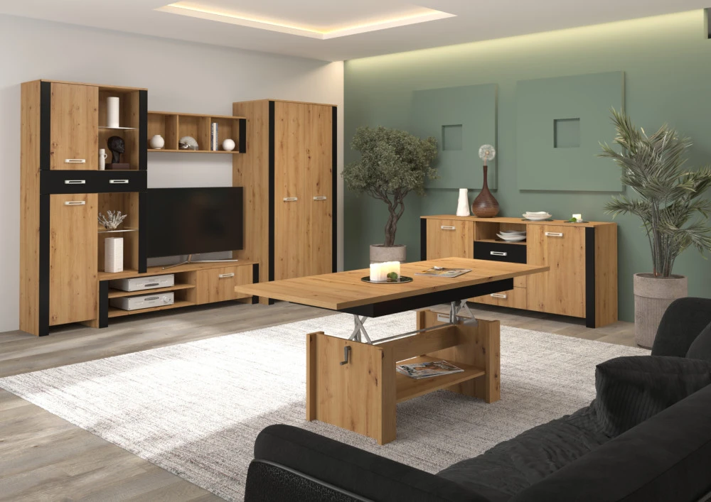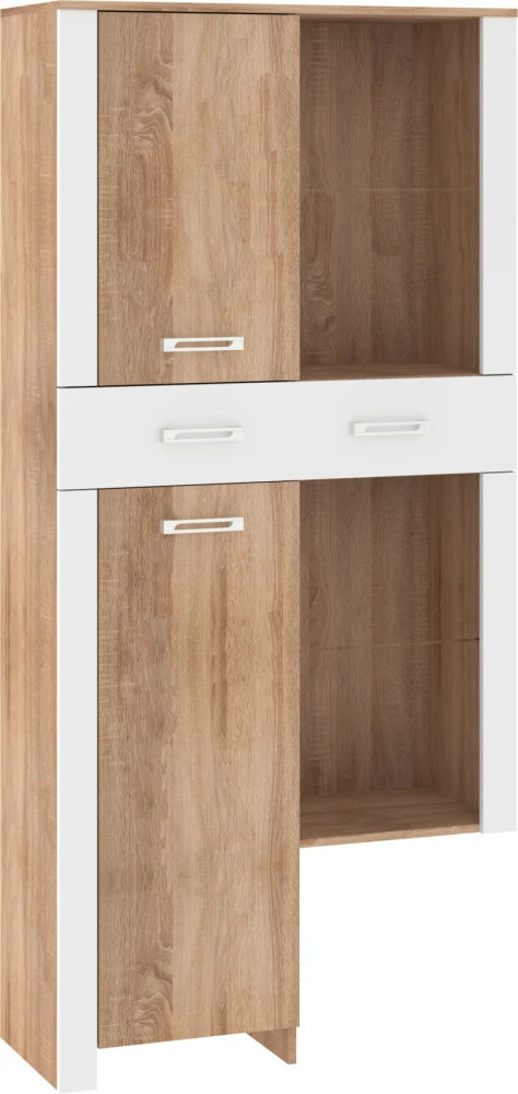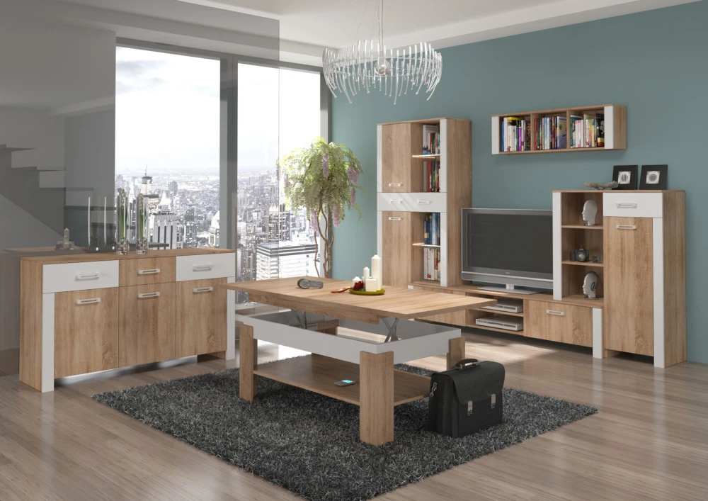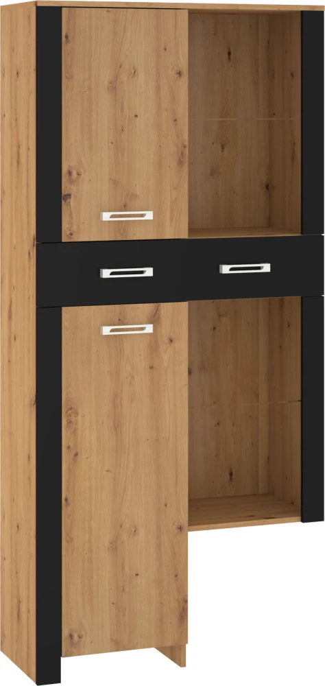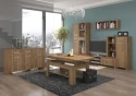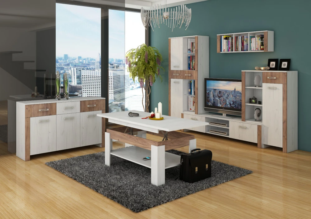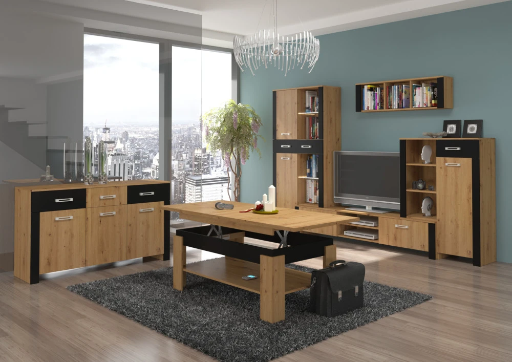 Vysoký regál z kolekce Hugo je modulovým komponentem k sestavení vlastní obývací stěny, připojením k televiznímu stolku. Disponuje na pravé straně policovým regálem, na levé straně dvěma skříňkami a uprostřed zásuvkou.