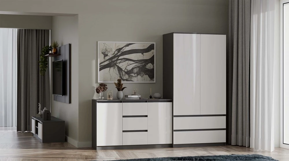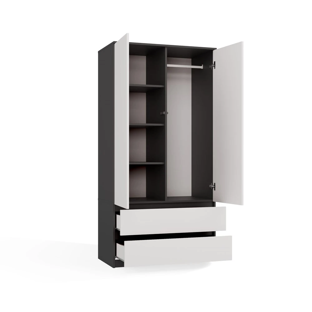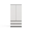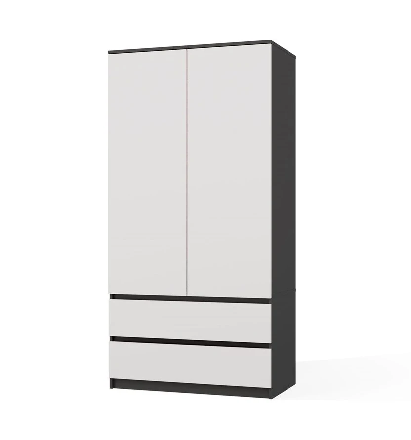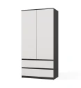 Šatní skříň Malvína v trendy barvách a moderním designu je praktický kus nábytku, který najde své uplatnění v ložnici, dětském pokoji, ale také v kanceláři nebo domácí pracovně. Nabízí dostatek úložného prostoru s možností instalace polic nebo šatní tyče v závislosti na vašich požadavcích. Dvířka se systémem TIP-ON se otevírají po jemném zatlačení čela dvířek. Nábytek je vyroben z nejkvalitnější laminované desky odolné proti poškrábání a vlhkosti, hrany jsou zakončené ABS materiálem.