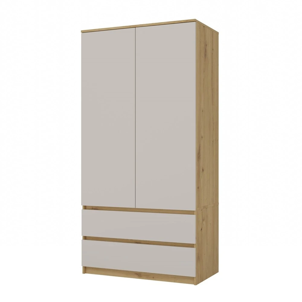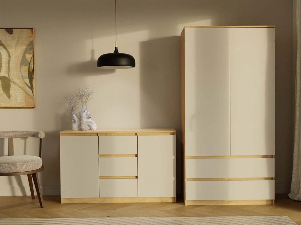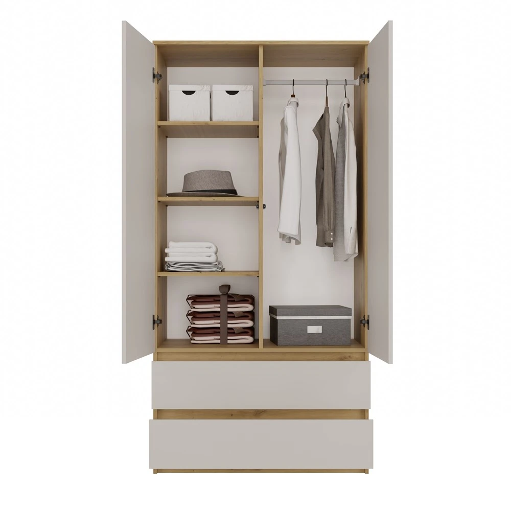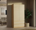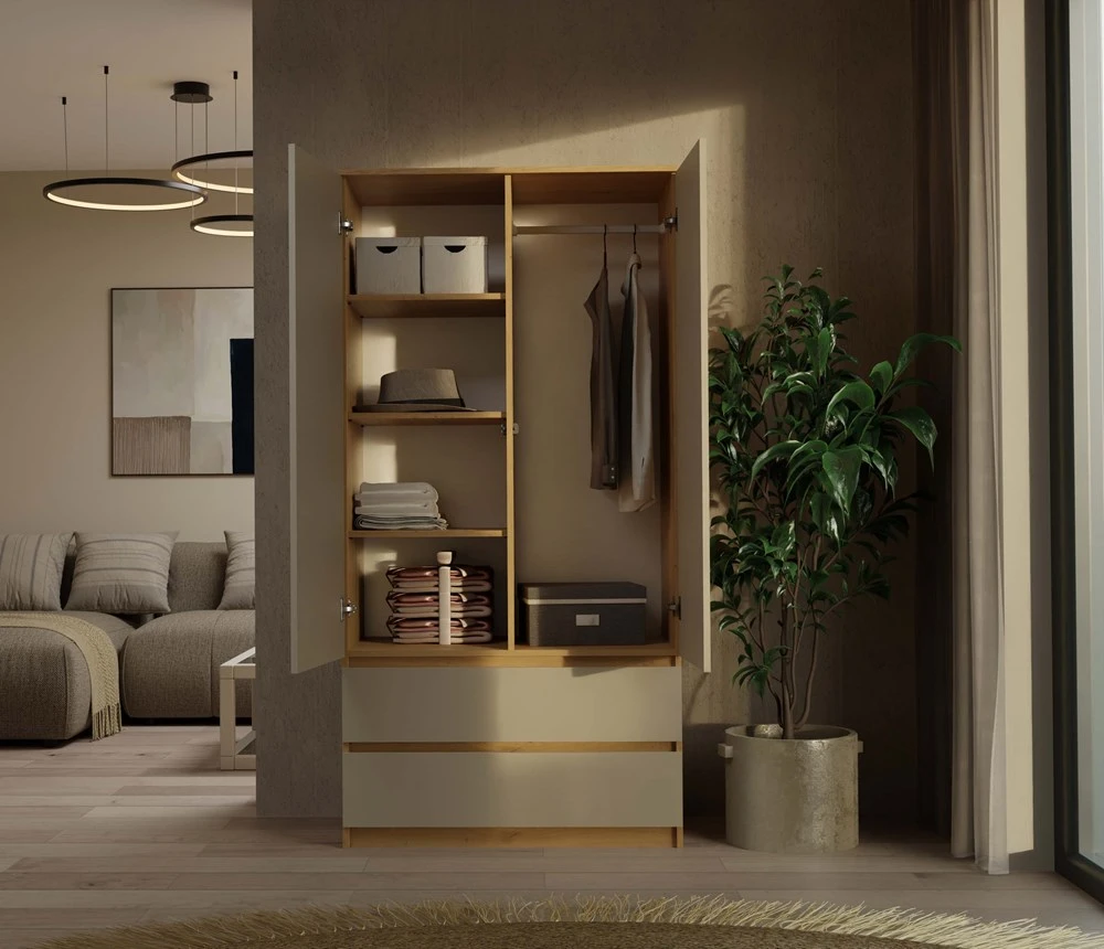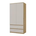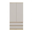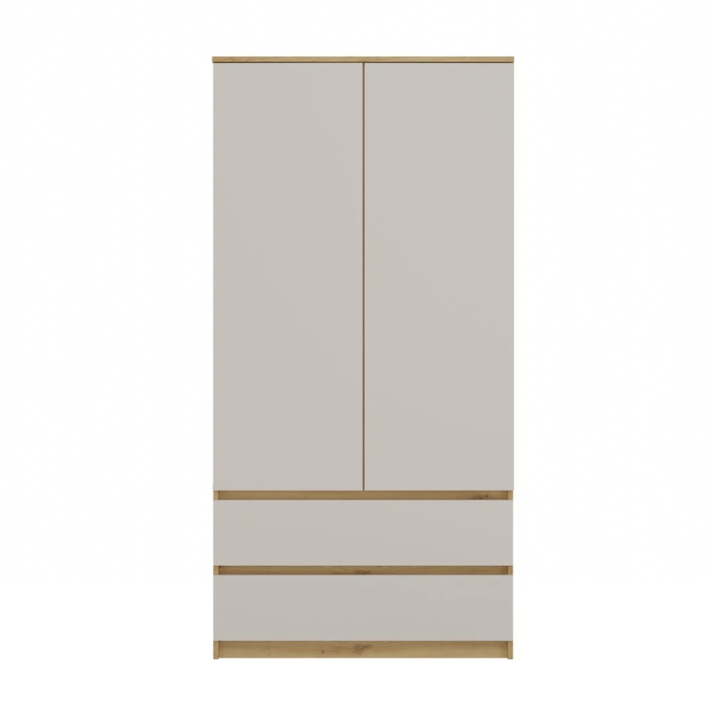 Šatní skříň Malvína v trendy barvách a moderním designu je praktický kus nábytku, který najde své uplatnění v ložnici, dětském pokoji, ale také v kanceláři nebo domácí pracovně. Nabízí dostatek úložného prostoru s možností instalace polic nebo šatní tyče v závislosti na vašich požadavcích. Dvířka se systémem TIP-ON se otevírají po jemném zatlačení čela dvířek. Nábytek je vyroben z nejkvalitnější laminované desky odolné proti poškrábání a vlhkosti, hrany jsou zakončené ABS materiálem.
