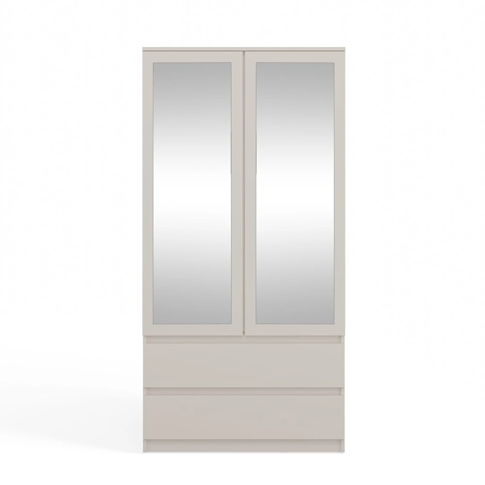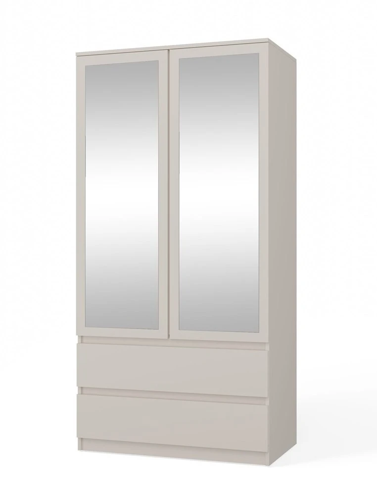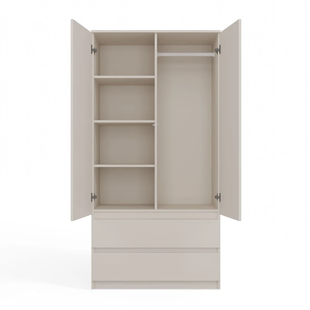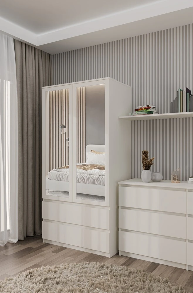 Šatní skříň Malvína v trendy barvách a moderním designu je praktický kus nábytku, který najde své uplatnění v ložnici, dětském pokoji, ale také v kanceláři nebo domácí pracovně. Nabízí dostatek úložného prostoru s možností instalace polic nebo šatní tyče v závislosti na vašich požadavcích. Dvířka se systémem TIP-ON se otevírají po jemném zatlačení čela dvířek. Nábytek je vyroben z nejkvalitnější laminované desky odolné proti poškrábání a vlhkosti, hrany jsou zakončené ABS materiálem.