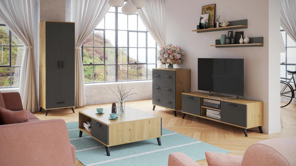 Komoda s šuplíky Roky 8 Grafit je vyrobena z lamina v krásném dekoru grafit a dub artisan. Lamino tloušťky 18 mm je odolné a je zakončeno lištou ABS. Jistě oceníte i snadnou údržbu. Komoda je velmi praktická a šuplíky pojmou vše potřebné. Rukojeti v dekóru dřeva jsou vyrobeny z plastu. Je dodávána v demontu. Součástí balení je montážní návod včetně všech spojovacích prvků.