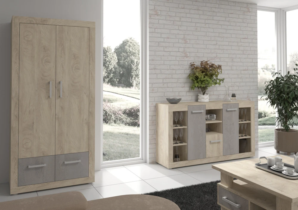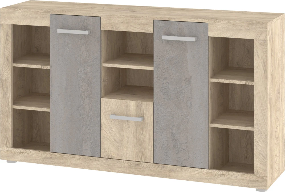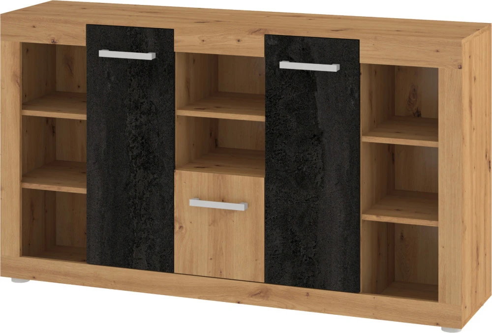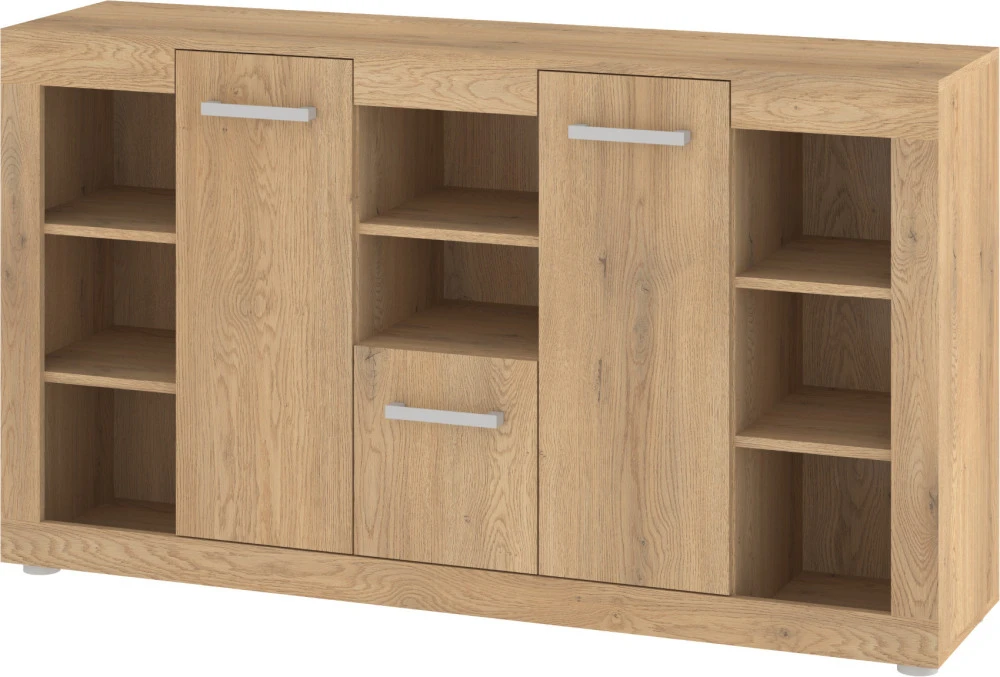 Praktická dělená komoda v kombinaci polic a dvířek, je vyrobena z lamina materiálu o síle 16 a 25 mm. Úchyty z odolného tvrzeného plastu, stříbrné barvy. Možnost výběru v několika barevných variantách. Dodáváno v demontu.