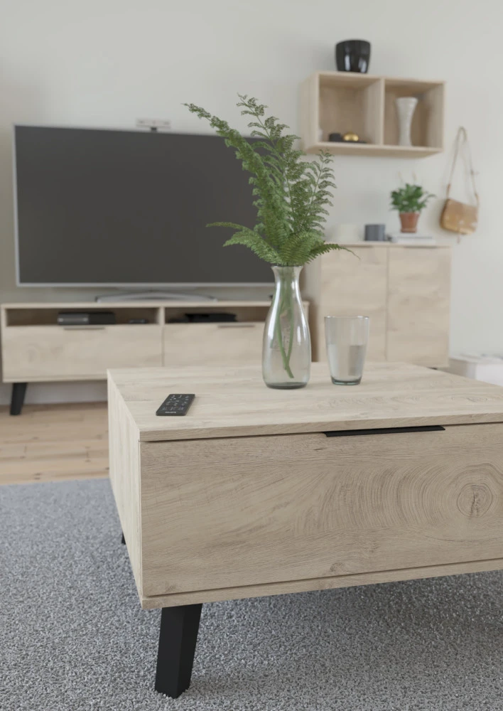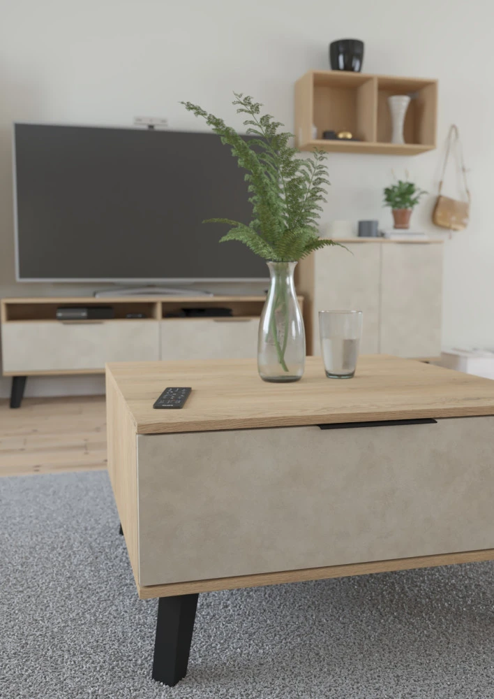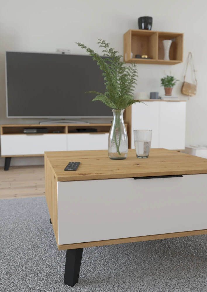 TV stolek je vybavený 2 výklopnými dvířky. Dodáváme jej v demontu.
