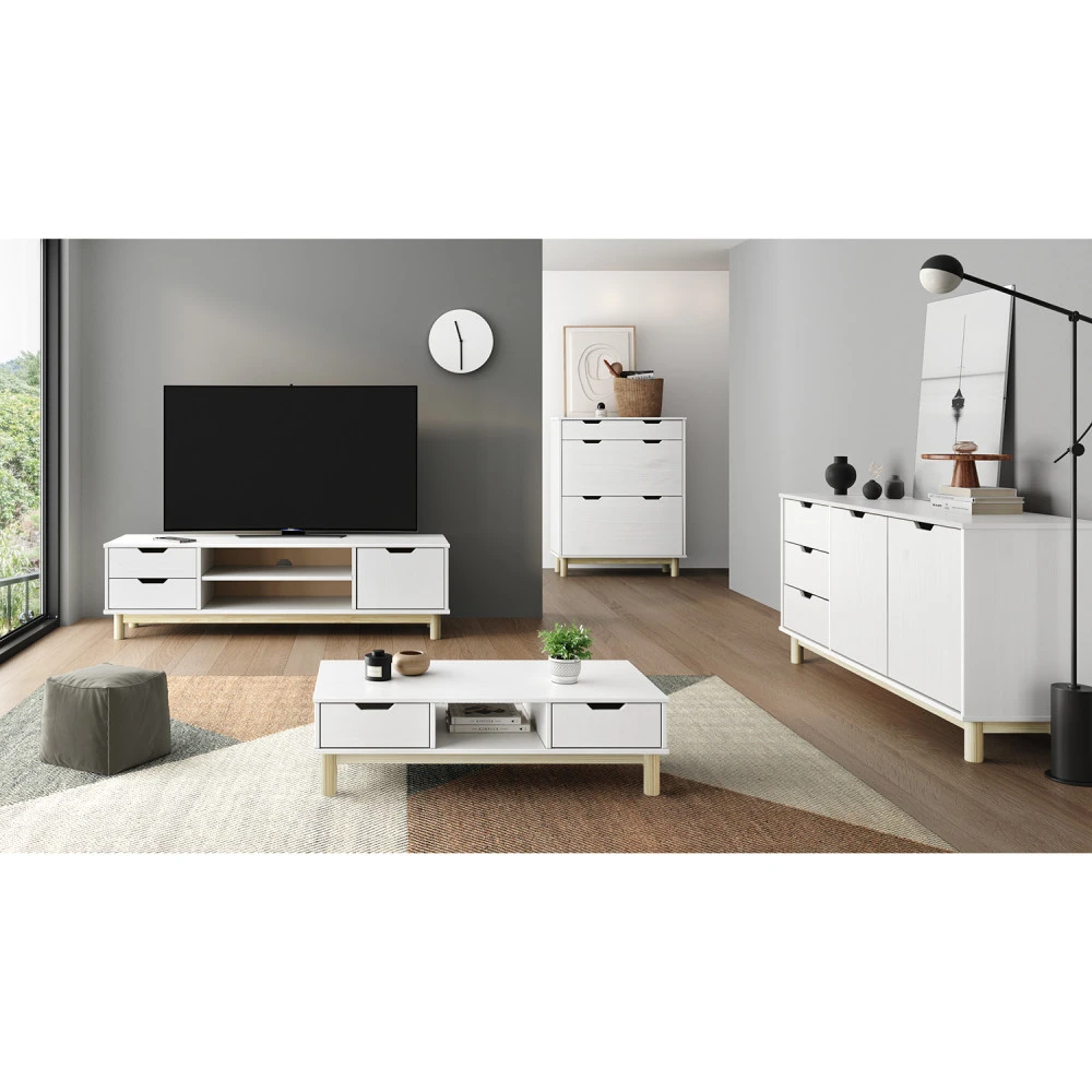 materiál masiv borovice, barevné provedení bílý lak 2 zásuvky s kovovými pojezdy, 1 dvířka, 1 police otvor na protažení kabelů