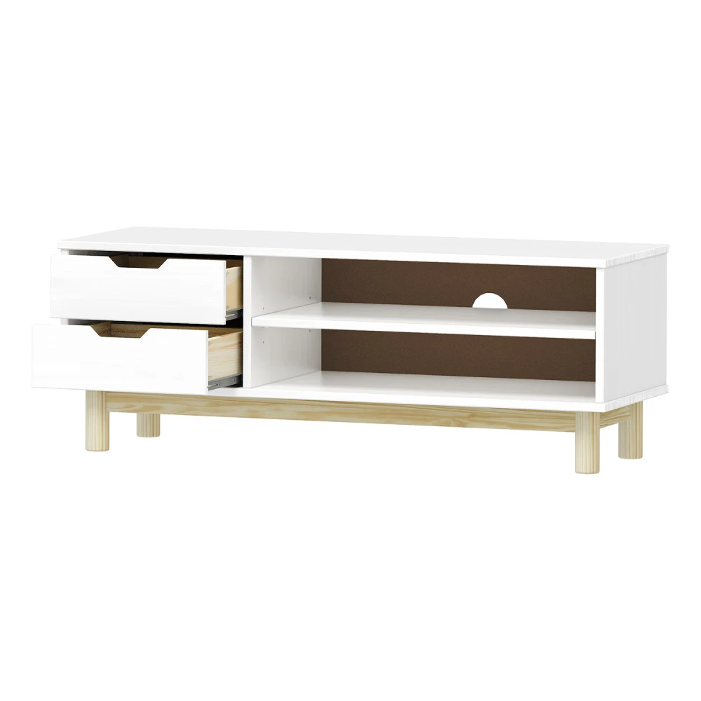 materiál masiv borovice, barevné provedení bílý lak 2 zásuvky s kovovými pojezdy, 1 police otvor na protažení kabelů