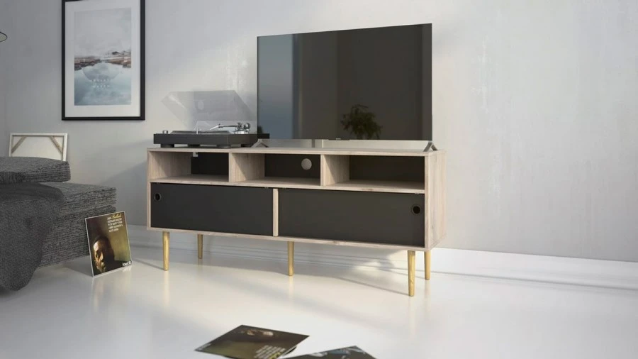 TV stolek Ruby díky svému provední nabízí dostatek prostoru nejen na televizi. S tímto stolkem budete mít doma přehledný a organizovaný pořádek. A pokud máte rádi retro styl, pak je tento stolek pro Vás jako stvořený. Je zhotovený z lamina které je odolné a snadné na údržbu. Retro vzhled zdůrazňují vysoké nožky , kulaté výřezy místo úchytek a posuvné dvířka. Stolek nabízíme ve dvou barevných provedeních. Je dodávaný v demontu a součástí je montážní plánek včetně všech potřebných spojovacích materiálů. Vyobrazené dopňky a dekorace nejsou v ceně.