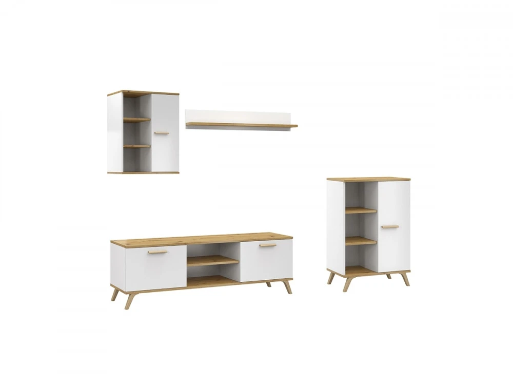 Sestava se skládá z TV stolku, závěsné skříňky, malé knihovny a polic.