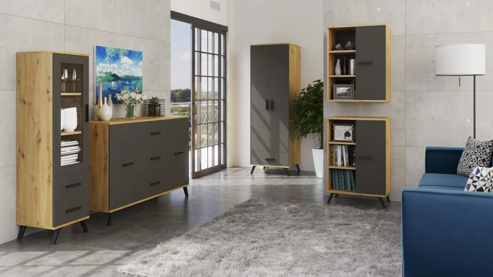 Roky Grafit je moderní bytová sestava v kombinaci 2 módních barev, grafit a dub artisan. Je vyrobena z vysoce kvalitní laminované dřevotřísky tloušťky 18 mm, odolné vůči poškrábání, vlhkosti a vysokým teplotám. Všechny hrany jsou opatřeny ABS lištou, která zajistí trvanlivost a odolnost proti nárazu. Díky této bytové stěně budete mít pohodlný i praktický interiér a také útulné a bezpečné prostředí, ve kterém se každý bude cítit dobře. Veškeré díly, které tato sestava obsahuje, si můžete objednat samostatně. Všechny prvky této sestavy jsou dodávány v demontu. Součástí je montážní plánek včetně všech potřebných spojovacích materiálů. Vyobrazené dekorace nejsou v ceně.