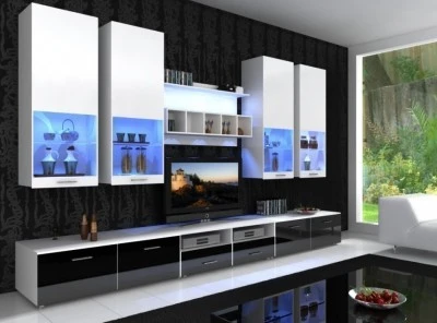 Obývací stěna v moderním designu. Korpus z 16mm lamina mat, dvířka lesk/sklo. V ceně obývací stěny je také LED podsvícení poliček. Dodáváno v demontu.