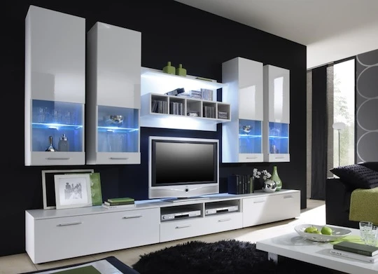 Sestava obsahuje: 3x TV skříňka, 4x závěsná skříňka, police.
