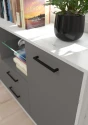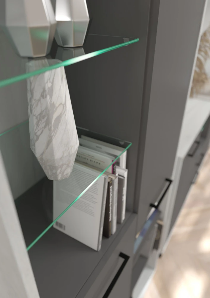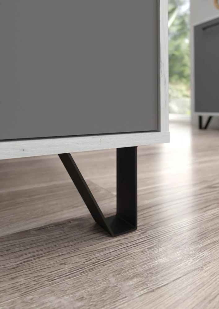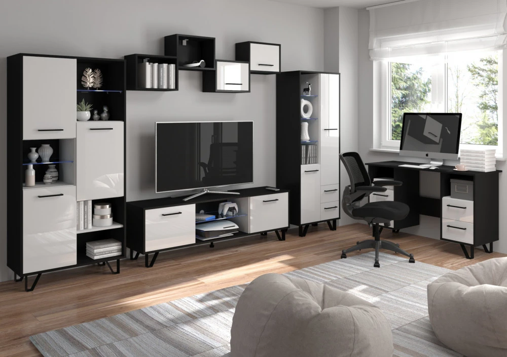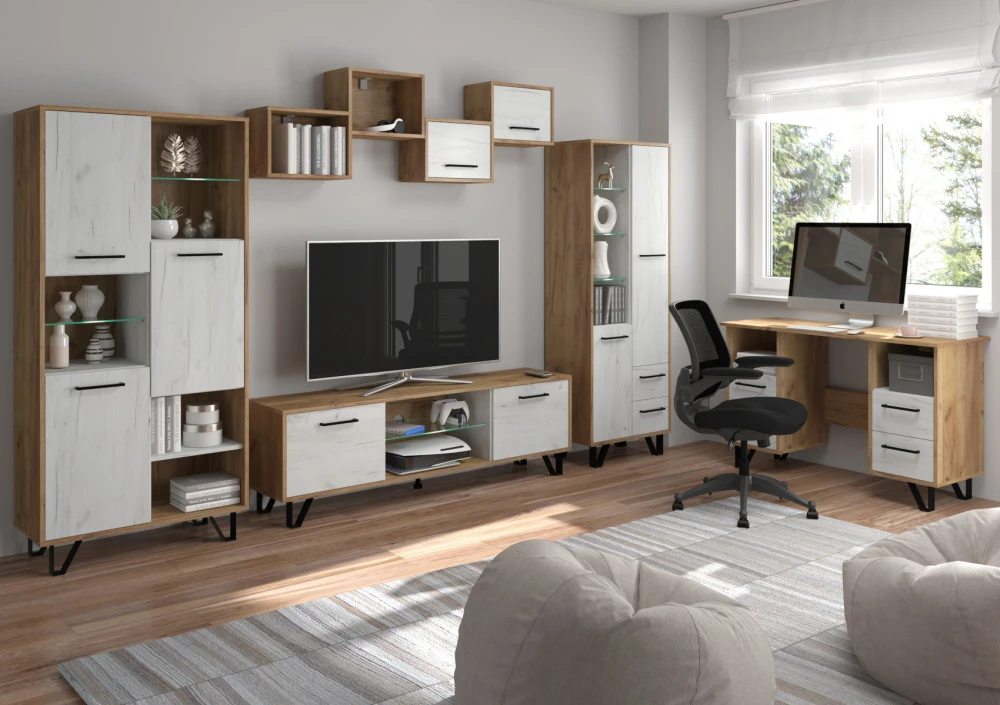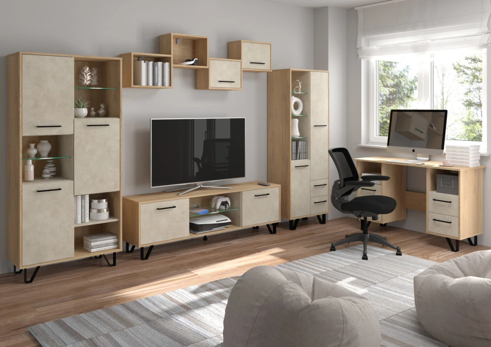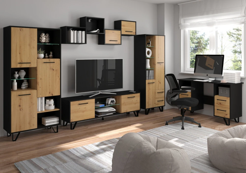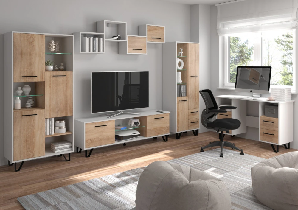 Obývací stěna Boss vás zaujme svým moderním elegantním designem a barevným provedením s přírodními detaily. Jednotlivé komodity jsou vyrobeny z kvalitních lamino desek o síle 16 mm. Desky mají ABS hranění, které zvyšuje odolnost pro odštípnutí hran. Součástí zásuvek a dvířek jsou jednoduché kovové úchyty a zároveň mají zabudovaný systém tichého dovírání. Nábytek stojí na kovových nožkách, které provzdušní váš interiér. Nabízíme vám několik barevných variant.Obývací stěna je sestavena z jednotlivých komodit systému Boss, ze kterých si vytvoříte svůj vysněný obývací pokoj, studentský pokoj, relaxační místnost či pracovnu.