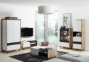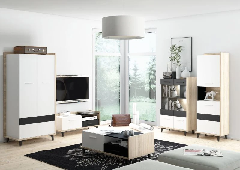 Obývací stěna z kolekce Box vyniká designem, který je kombinací moderních prvků s retrem. Kombinace dřevodekorů s nestárnoucí bílo-černou kombinací je sázkou na jistotu. Nábytek vyrobený z kvalitních lamino materiálů má hrany chráněné ABS. Kombinace 16 mm a 25 mm silných desek zajistí stabilitu a odolnost nábytku Box. Zásuvky mají kovové pojezdy opatřené tichými dojezdy. Retro nádech kolekci Box dodávají 12 cm vysoké nožky, které nejen dobře vypadají, ale také vám umožní jednoduchý úklid i pod skříňkami. Údržba nábytku je snadná, stačí vám vlhký hadřík či prachovka. Obývací stěna se skládá z regálu Box 07, TV stolku Box 08, skříně Box 10 a vitríny Box 12.