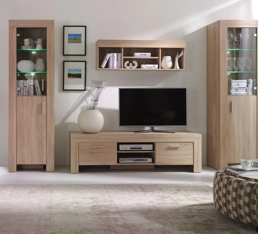 V ceně sestavy je vitrína levá, TV stolek, police, vitrína pravá