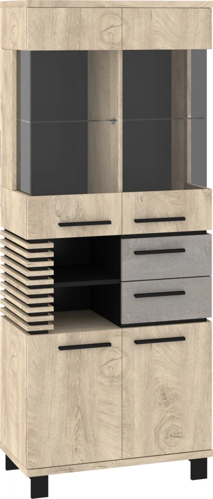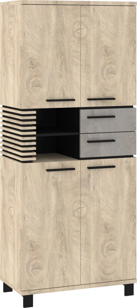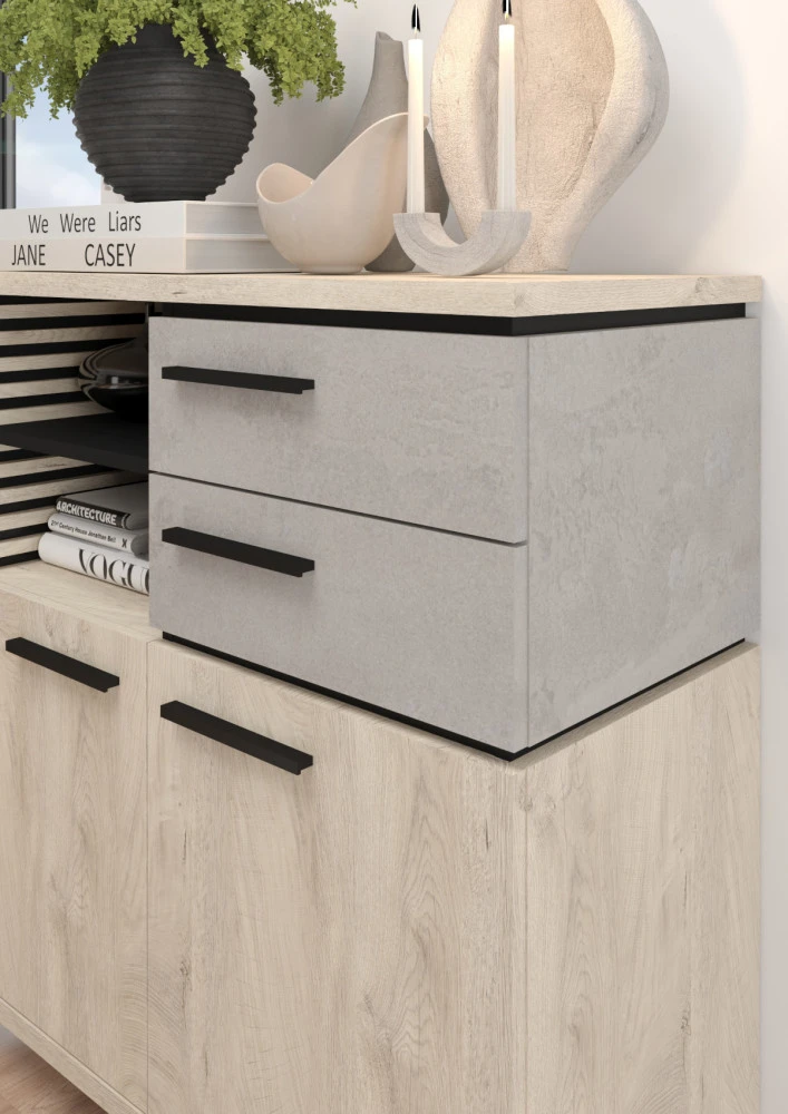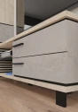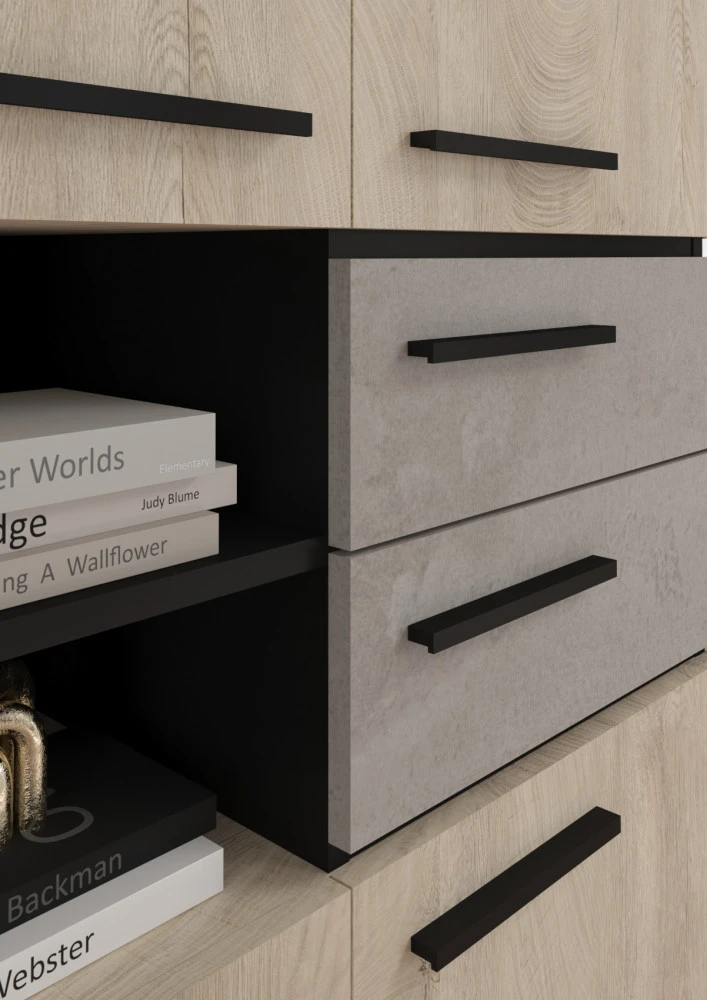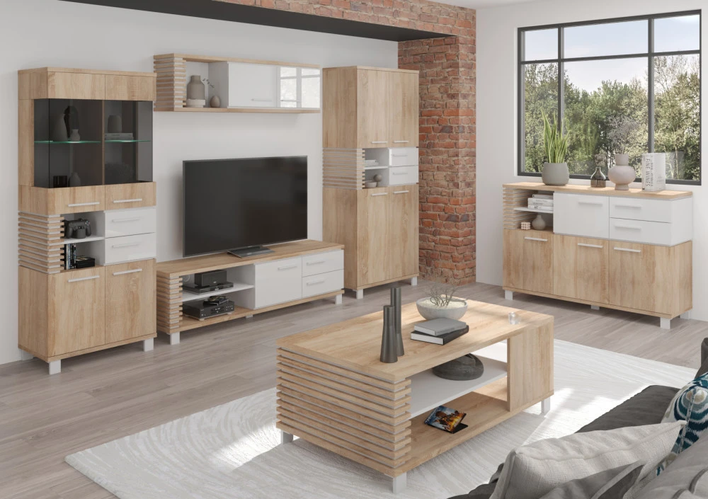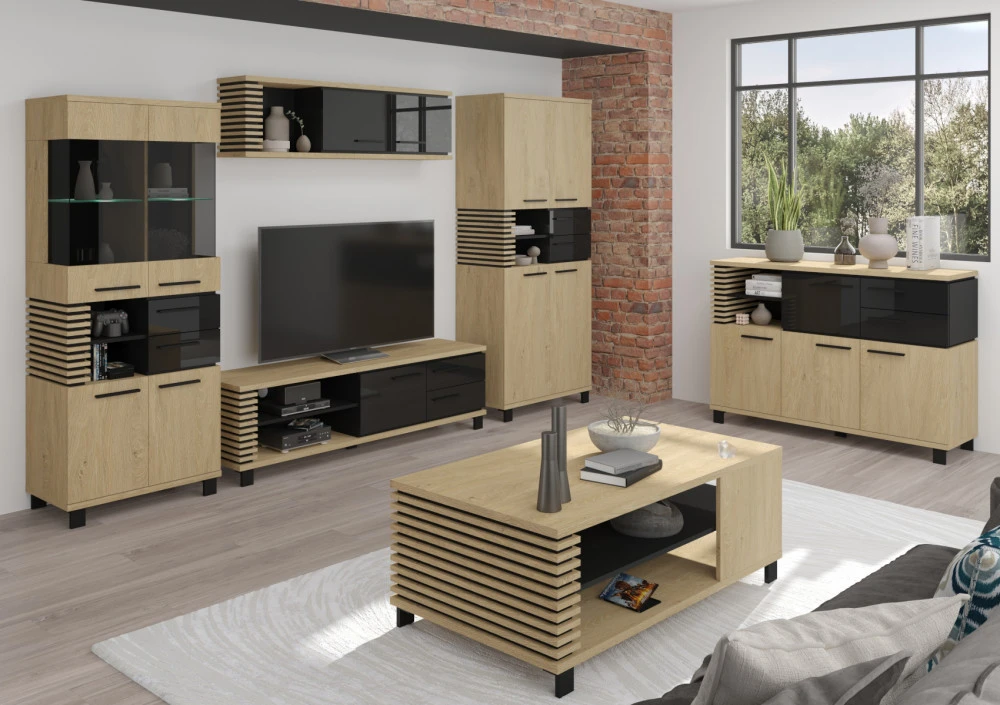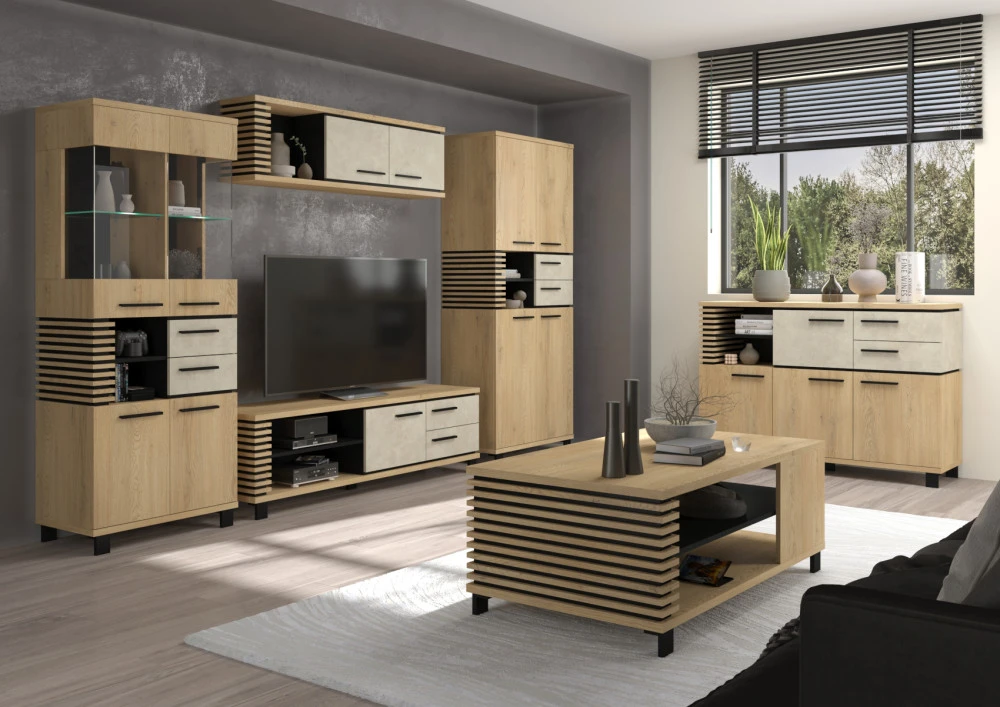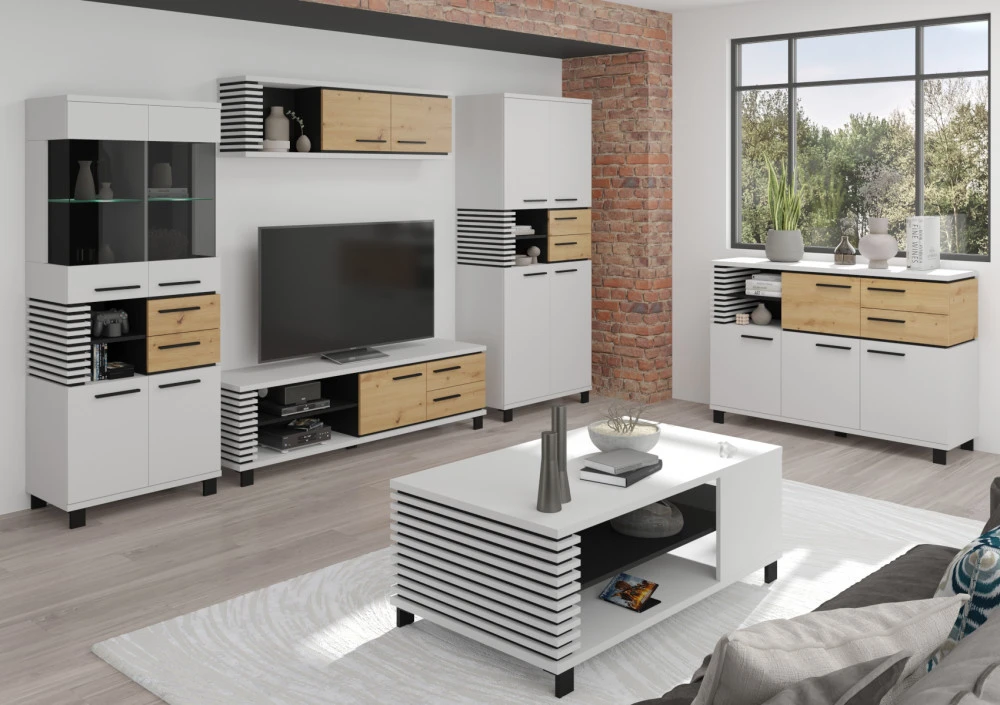 Obývací stěna Lamir vás zaujme svým moderním elegantním designem s luxusními přírodními detaily. Jednotlivé komponenty jsou vyrobeny z kvalitních lamino desek o síle 16 mm a 25 mm. Desky mají ABS hranění, které zvyšuje odolnost pro odštípnutí hran. Součástí zásuvek a dvířek jsou jednoduché kovové úchyty a zároveň mají zabudovaný systém tichého dovírání. Nábytek stojí na 8 cm nožkách, které provzdušní váš celkový interiér. Nabízíme vám několik barevných variant.Obývací stěna je sestavena z jednotlivých komodit systému Lamir, ze kterých si vytvoříte svůj vysněný obývací pokoj, relaxační místnost či pracovnu.