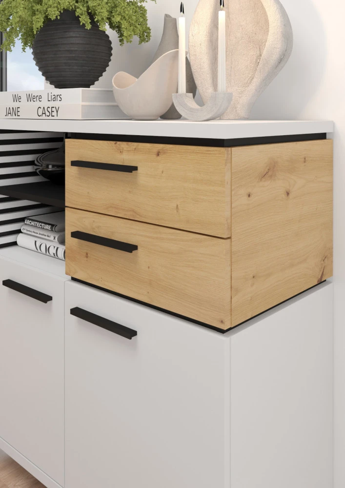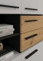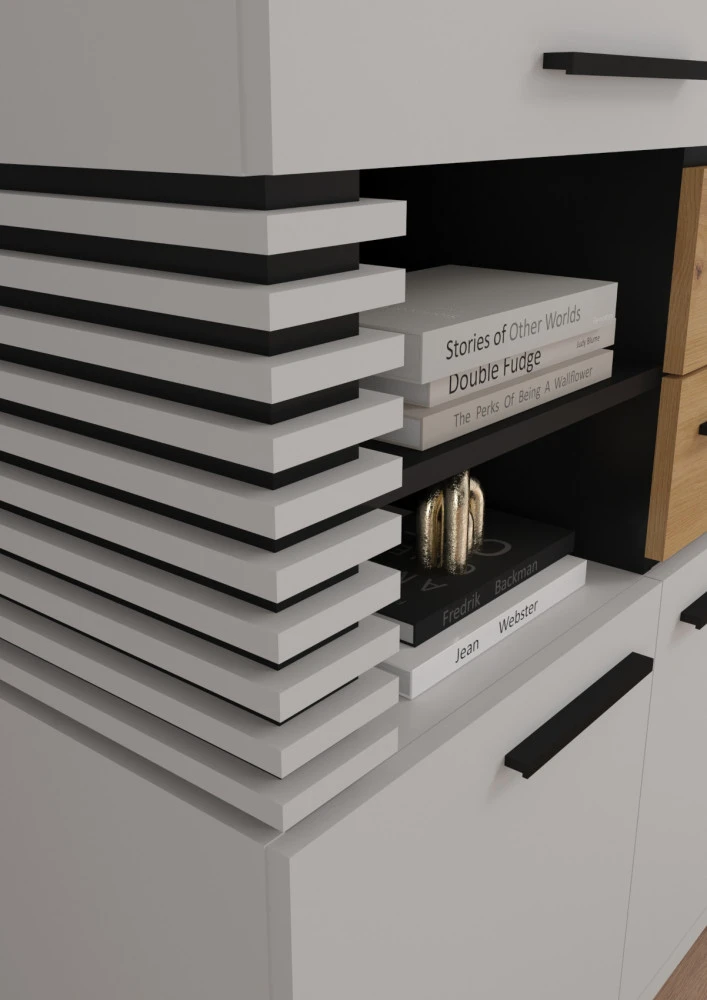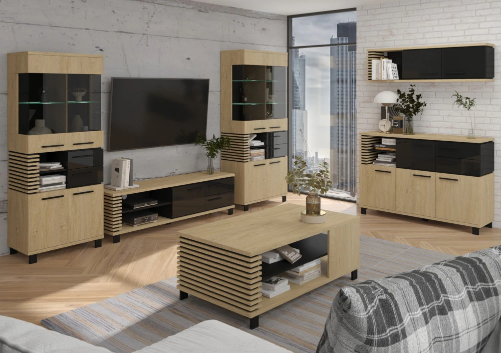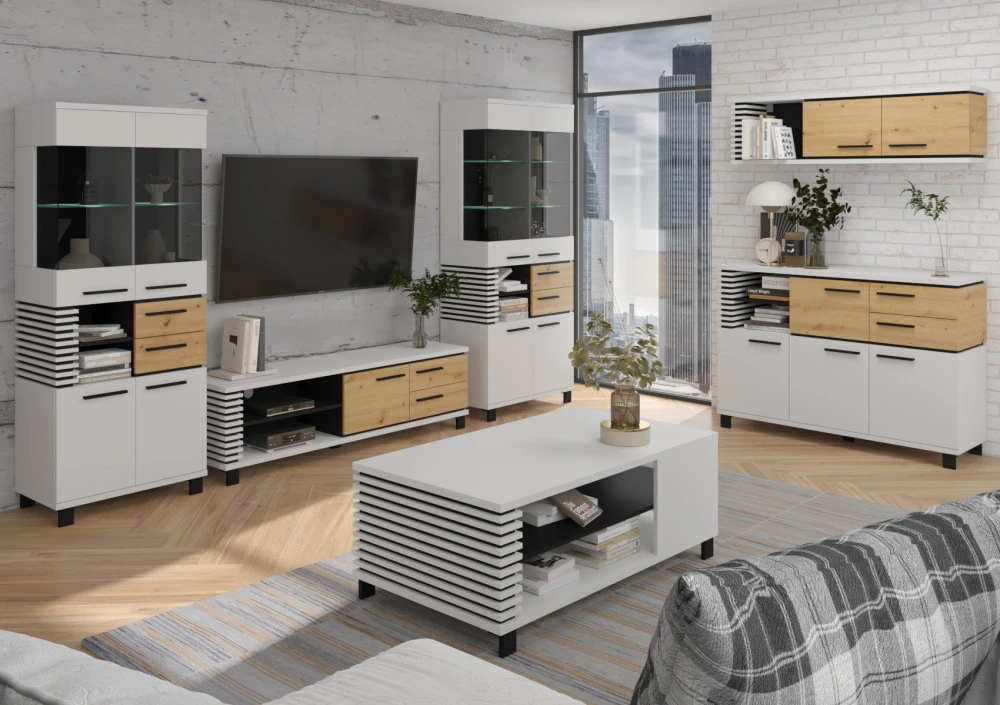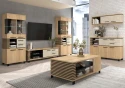 Obývací stěna Lamir vás zaujme svým moderním elegantním designem s luxusními přírodními detaily. Jednotlivé komponenty jsou vyrobeny z kvalitních lamino desek o síle 16 mm a 25 mm. Desky mají ABS hranění, které zvyšuje odolnost pro odštípnutí hran. Součástí zásuvek a dvířek jsou jednoduché kovové úchyty a zároveň mají zabudovaný systém tichého dovírání. Nábytek stojí na 8 cm nožkách, které provzdušní váš celkový interiér. Nabízíme vám několik barevných variant.Obývací stěna je sestavena z jednotlivých komodit systému Lamir, ze kterých si vytvoříte svůj vysněný obývací pokoj, relaxační místnost či pracovnu.