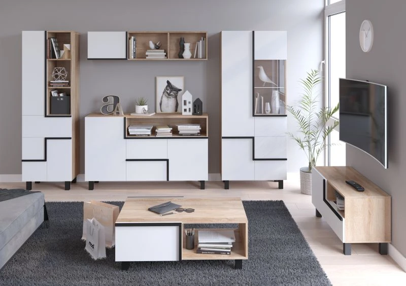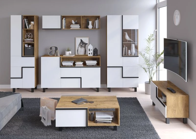 Stěnu vám dodáme v demontu. Části sestavy si můžete objednat také samostatně, či je zkombinovat s jinými prvky kolekce a vytvořit si tak obývák podle svých představ.