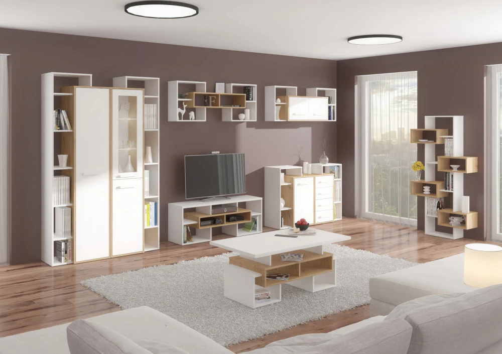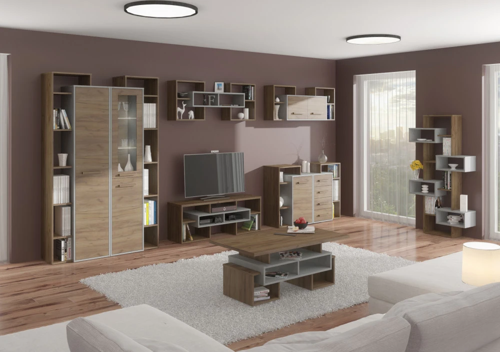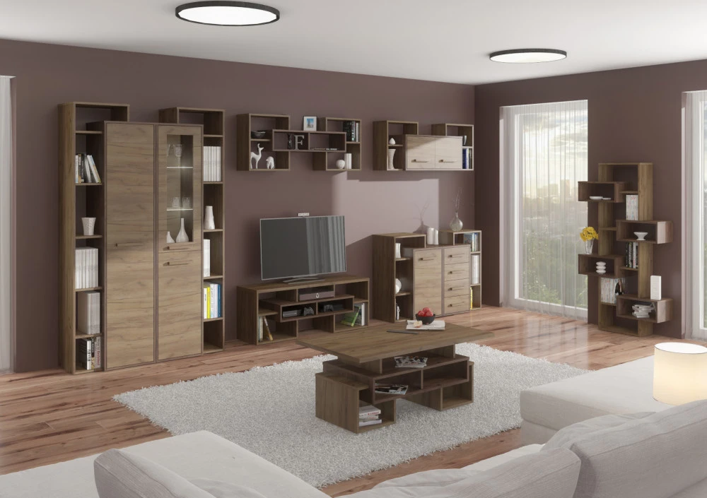 Obývací stěna Rio 7 obsahuje - skříň L Rio 01, komoda L1D Rio 08, komoda P4S Rio 09, police Rio 14, police 2D Rio 16, TV stolek Rio 20, vitrína P1D Rio 28. Lze si přikoupit také konferenční stolek s Rio 12 a regál Rio 18, které nejsou součástí ceny ani dodávky.