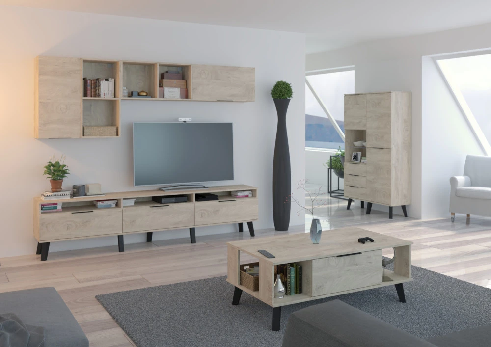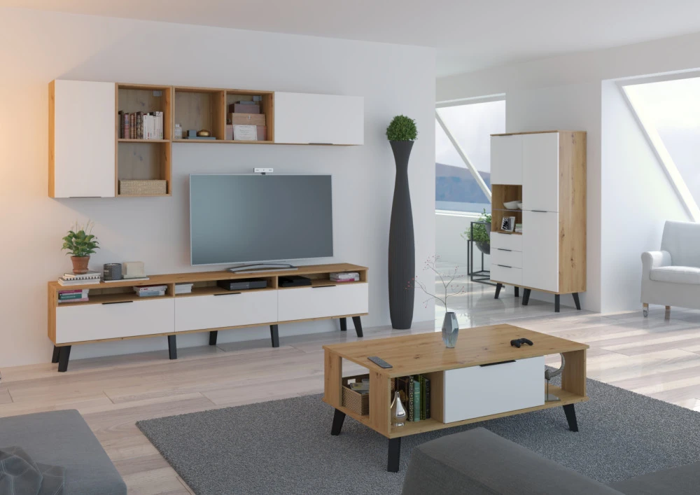 Sestava se skládá z TV stolku Sven 12, 2x závěsné skříňky Sven 14, závěsné skříňky Sven 15 a závěsné skříňky Sven 16.