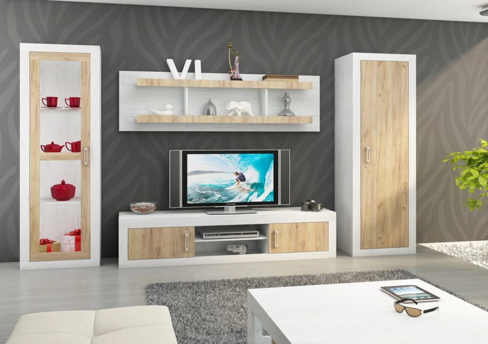 Cena sestavy Verin 4 zahrnuje: šatní skříň Verin 06, police Verin 03, televizní stolek Verin 05, vitrínu Verin 08.