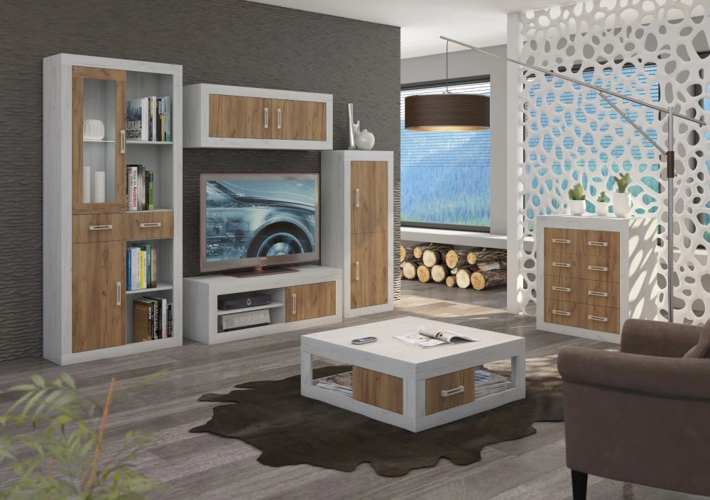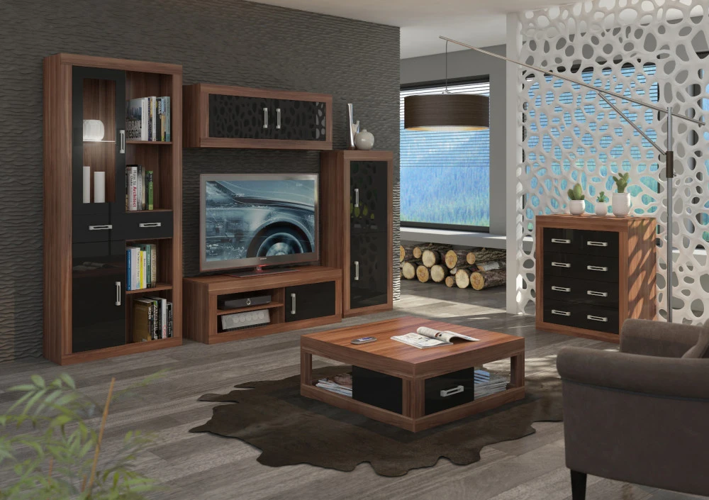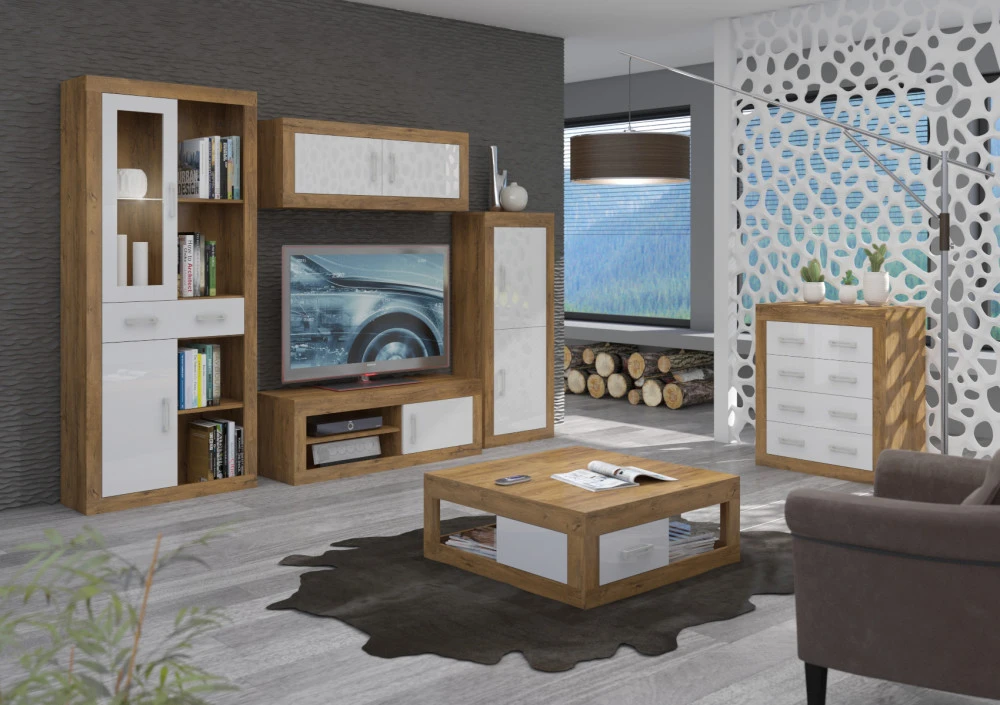 Cena zahrnuje: televizní stolek Verin 21, regál Verin 17, regál Verin 15, závěsná skříňka Verin 23.