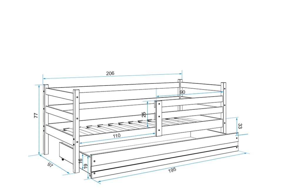 Dětská postel Norbert je určena pro ty, kteří pro své dítě hledají funkčnost a kvalitu. Postel je vyrobena z borovicového dřeva, které je lakováno 3x a tím je zajištěna jasnost a barevná stálost. Na lakování je použitý bezpečný, vodou ředitelný lak vyhovující normám. Její stabilní konstrukce, zaoblené hrany a zábrana, která je v ceně postele, zajišťují bezpečnost a pohodlí dítěte. Zábranu si můžete podle potřeby umístit na pravou, nebo levou stranu postele. Součástí postele je také praktický úložný prostor na kolečkách, rošt a pěnová matrace se snímatelným potahem. Tloušťka matrace je 7cm. Plocha pro spaní je 90x200 cm. Postel je dodávána v demontu a součástí je montážní plánek včetně všech potřebných spojovacích materiálů. Vyobrazené dekorace nejsou v ceně.