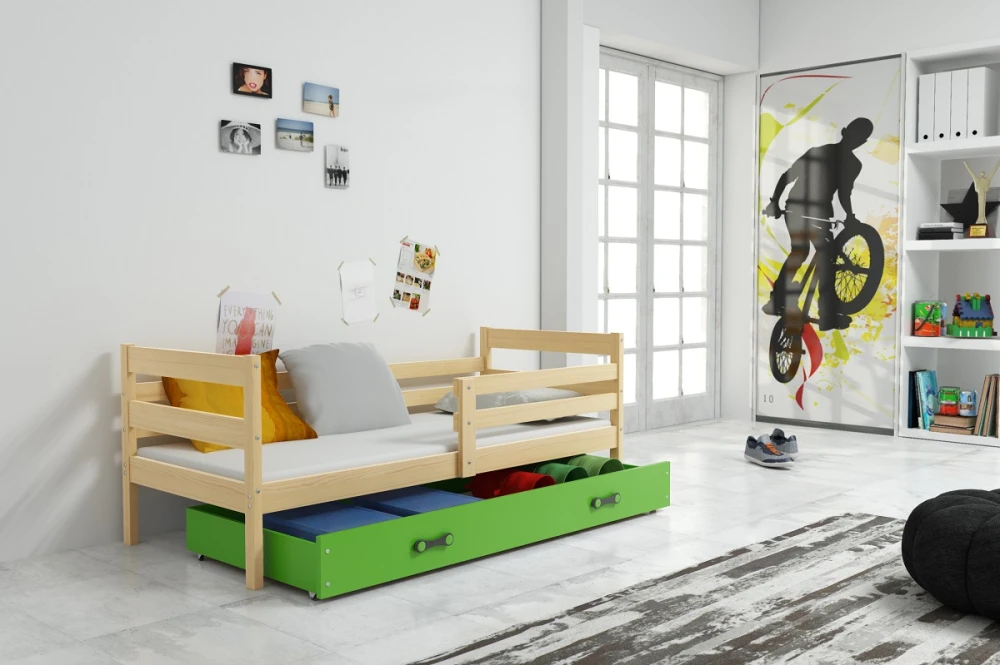 Dětská postel Norbert je určena pro ty, kteří pro své dítě hledají funkčnost a kvalitu. Postel je vyrobena z borovicového dřeva, které je lakováno 3x a tím je zajištěna jasnost a barevná stálost. Na lakování je použitý bezpečný, vodou ředitelný lak vyhovující normám. Její stabilní konstrukce, zaoblené hrany a zábrana, která je v ceně postele, zajišťují bezpečnost a pohodlí dítěte. Zábranu si můžete podle potřeby umístit na pravou, nebo levou stranu postele. Součástí postele je také praktický úložný prostor na kolečkách, rošt a pěnová matrace se snímatelným potahem. Tloušťka matrace je 7cm. Plocha pro spaní je 90x200 cm. Postel je dodávána v demontu a součástí je montážní plánek včetně všech potřebných spojovacích materiálů. Vyobrazené dekorace nejsou v ceně.