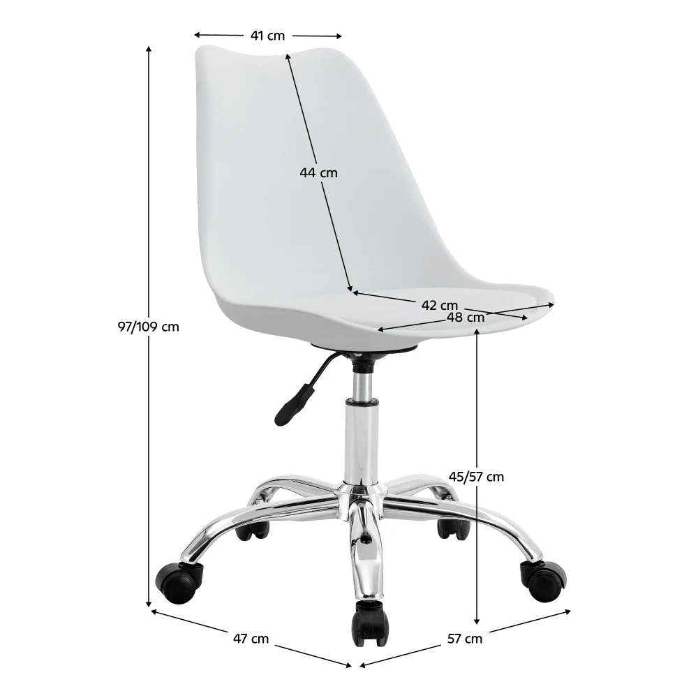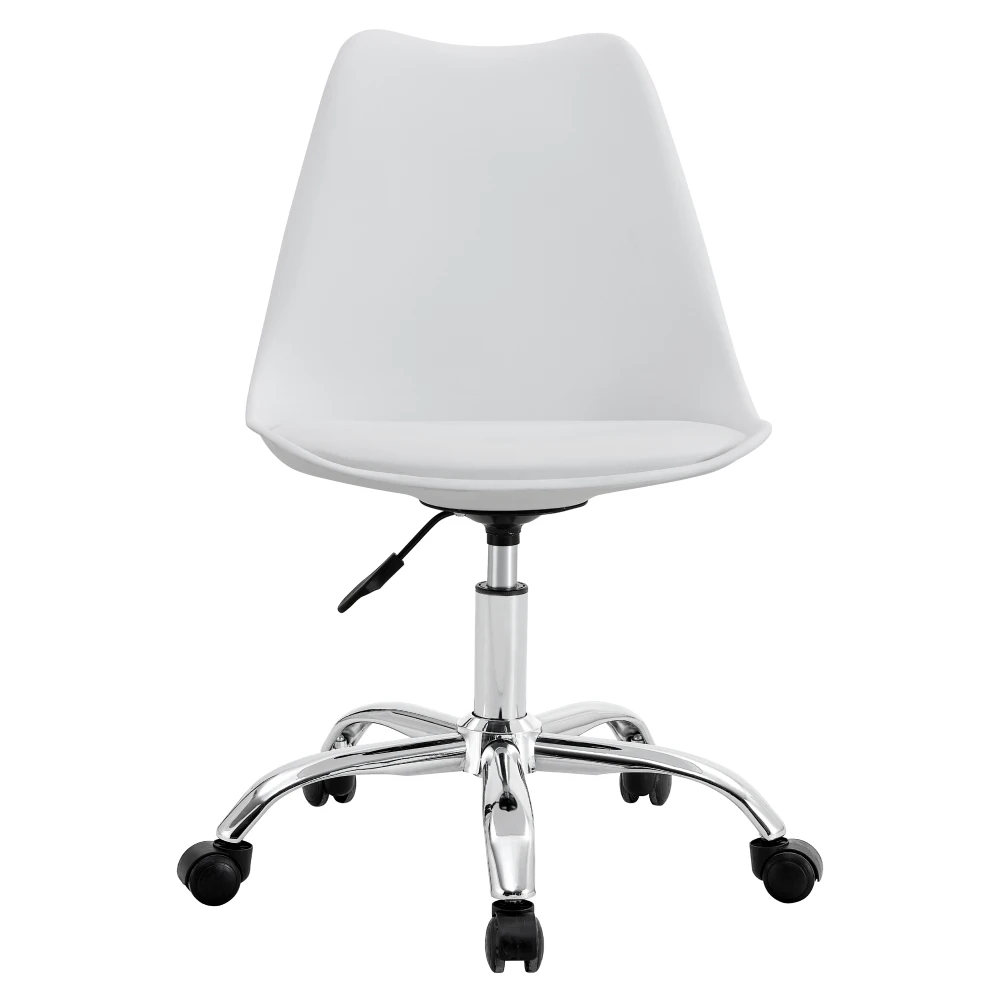 Moderní kancelářská židle v kombinaci bílé ekokůže a chromu nabízí elegantní vzhled, pohodlí a praktické funkce pro každodenní práci. Díky čistému designu se skvěle hodí do domácí pracovny i kanceláře.