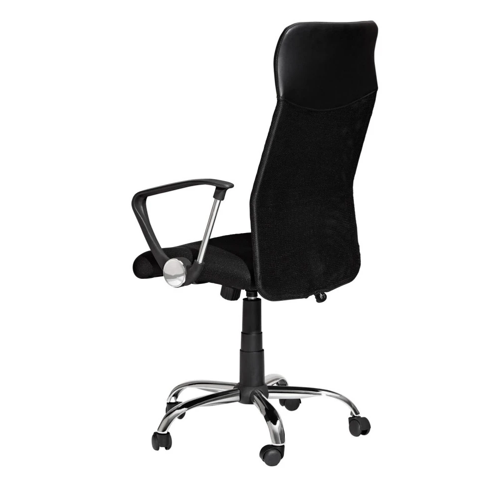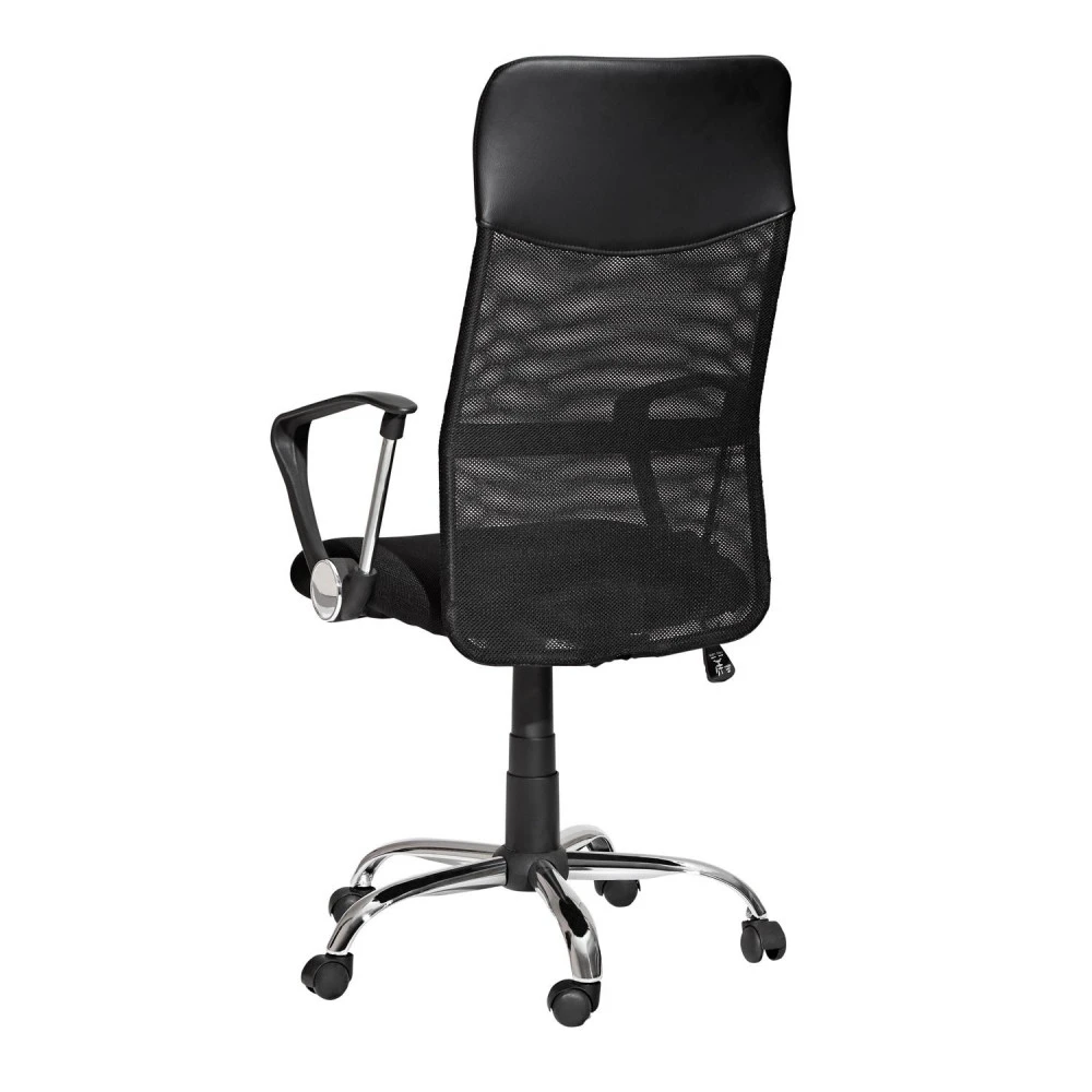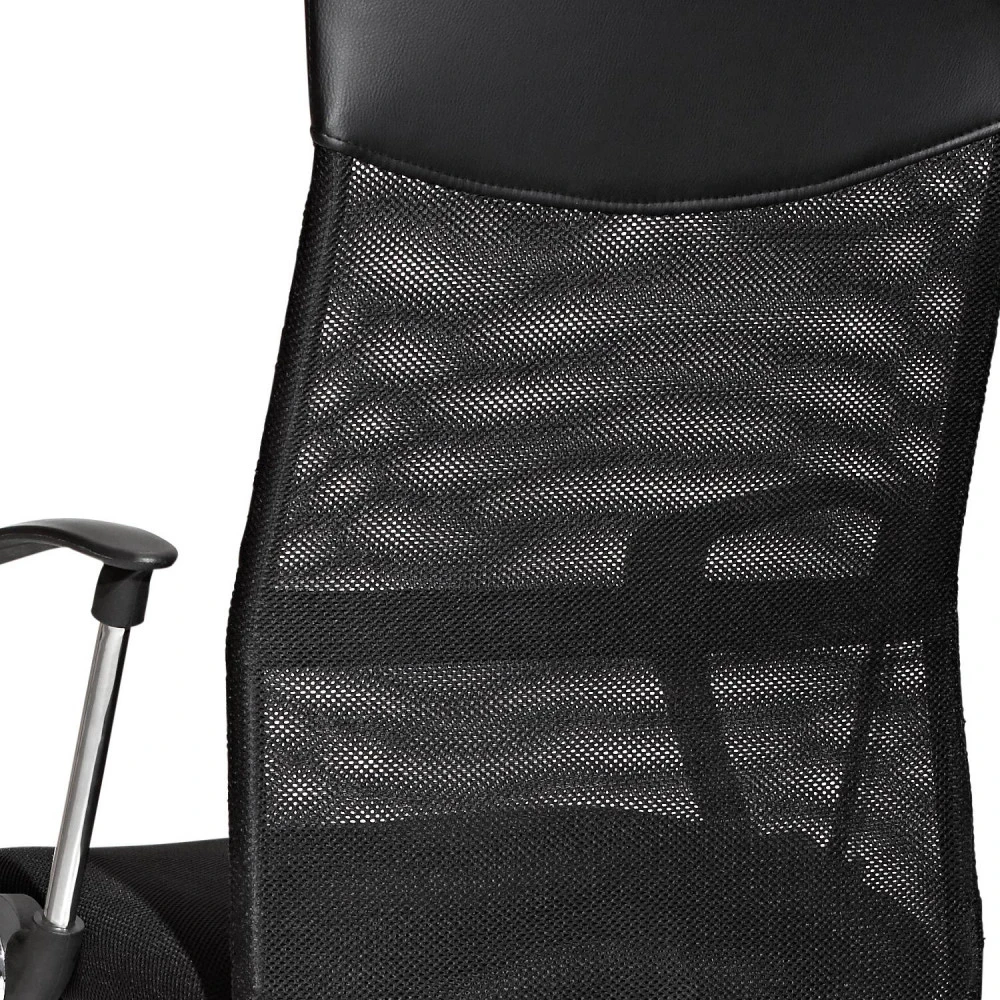 textilní potah, opěradlo textilní síťovina a kůže – imitace barevné provedení černá chromovaný kříž, houpací mechanismus výška sedu 41-50 cm, výška opěradla 68 cm doporučená nosnost do 120 kg