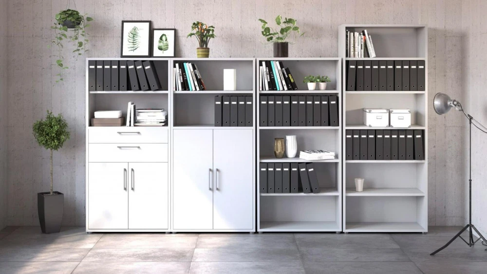 Nadčasová řada Office nabízí nekonečně mnoho úložných řešení pro vaši kancelář, domácí pracovnu nebo studentský pokoj. Knihovny a kancelářské skříňky je možné doplnit zásuvkami (s kovovými pojezdy) a dvířky v různých variantách, což vám umožňuje vytvořit si kancelář přesně podle vašich potřeb a přání. Sortiment této řady vyrobený z odolného a snadno udržovatelného lamima obsahuje také širokou škálu kancelářských stolů, pojízdných zásuvkových kontejnerů a variabilních prvků.