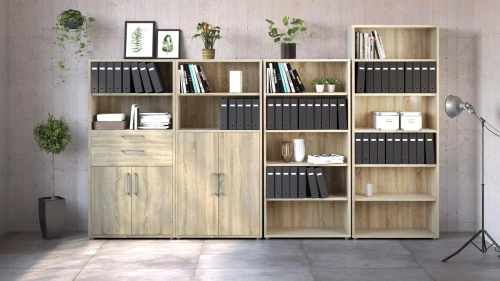 Nadčasová řada Office nabízí nekonečně mnoho úložných řešení pro vaši kancelář, domácí pracovnu nebo studentský pokoj. Knihovny a kancelářské skříňky je možné doplnit zásuvkami (s kovovými pojezdy) a dvířky v různých variantách, což vám umožňuje vytvořit si kancelář přesně podle vašich potřeb a přání. Sortiment této řady vyrobený z odolného a snadno udržovatelného lamima obsahuje také širokou škálu kancelářských stolů, pojízdných zásuvkových kontejnerů a variabilních prvků.
